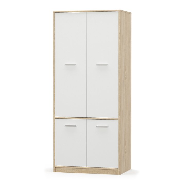 4-dverová vešiaková skriňa TEYO 4D nádherne oživí a zariadi izbu Vašich ratolestí. Rozmery skrine sú (ŠxHxV): 83x55x195 cm. Je vyrobená z kvalitnej laminovanej DTD (drevotriesková doska). Jemná farebná kombinácia dubu sonoma s bielou dodáva nábytku nadčasovosť. Skriňa poskytuje dostatok úložného…