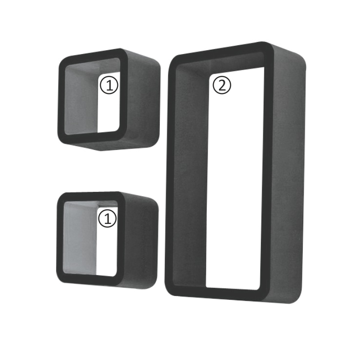 Modernú sadu políc TRIX tvoria 3 ks závesných políc s rôznymi rozmermi (2×17,5x10x17,5 cm, 42x10x21,5 cm), ktoré výborne zaplnia priestor na prázdnej stene. Police sú vyrobené z MDF čiernej farby.