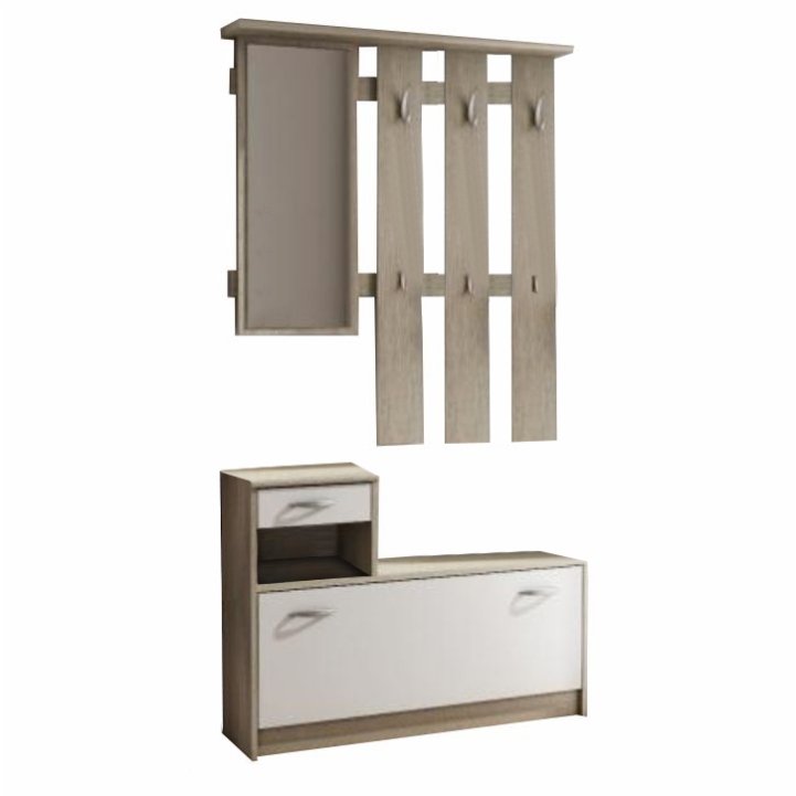 Elegantnú predsieň VIRA-MECKI možno zakúpiť ako zostavu, ktorá pozostáva z vešiakového panelu so zrkadlom a botníku so zásuvkou. Predsieň je vyrobená z fóliovanej DTD v prevedení dub sonoma / biela. K zostave odporúčame dokúpiť policovú skriňu Vira.
