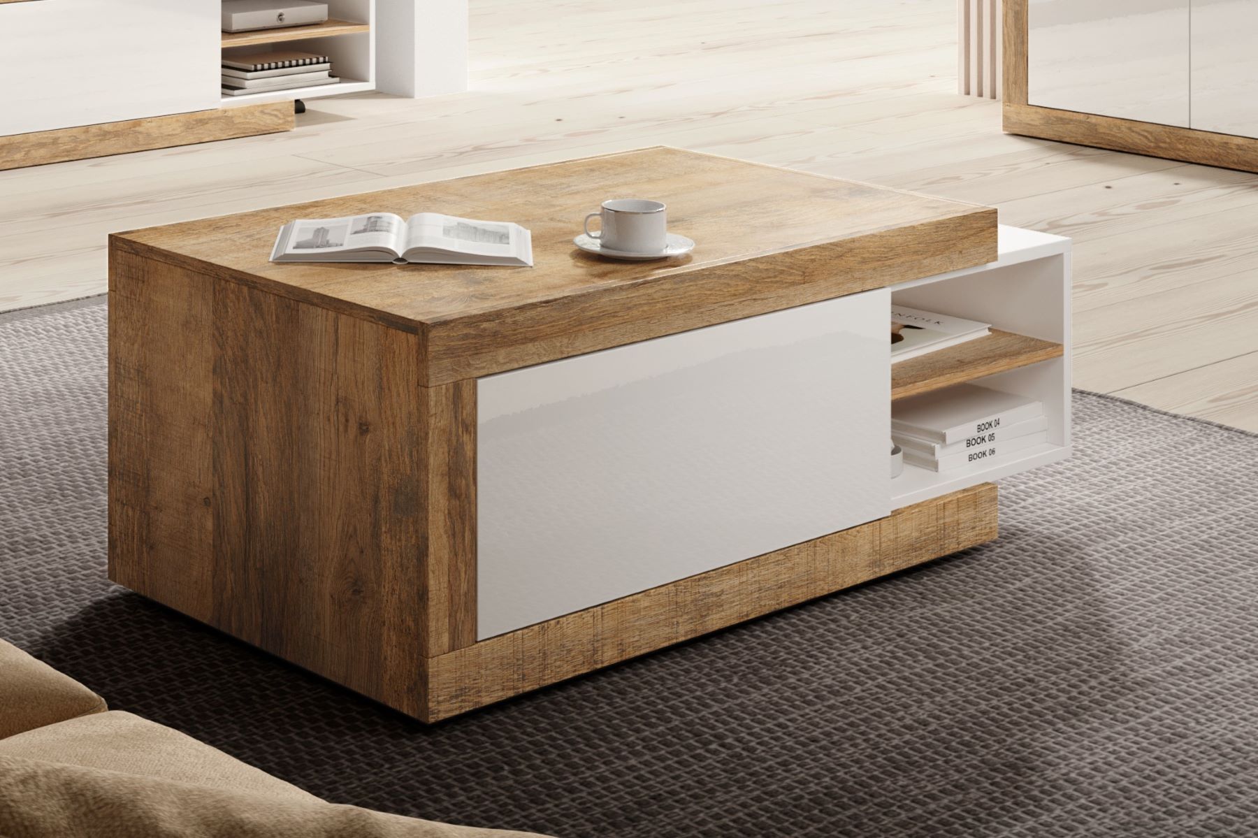 Sektorový nábytok SINATRA je určený pre ľudí , ktorí majú radi spojenie modernosti a elegancie. Biela lesklá dodáva sektoru ľahkosť a ideálne sa hodí k odtieňu dub sambdal. Sektor má pevnú konštrukciu a je vyrobený z kvalitných materiálov. Systém otvárania dvierok je push to open.Konferenčný stolík SINATRA 99 je vynikajúcou voľbou pre ľudí, ktorí radi prijímajú návštevy ako aj tiež pre tých, ktorí radi trávia čas osamote pri káve. Vďaka možnosti roztiahnutia zaisťuje pohodlné používanie prispôsobené individuálnym potrebám každého klienta. Dve otvorené police sú ideálnym miestom na vystavenie doplnkov, ktoré dodájú stolíku svoje čaro. Zá výklopné dvierka si môžete uložiť veci, ktoré nechcete aby boli viditeľné čo je ďaľšia výhoda stolíka.Materiál : kvalitná certifikovaná drevotrieska odolná voči UV žiareniu a poškriabaniuFarebné prevedenie: dub samdal/bielaRozmer: (ŠxVxH) 120-153 x 43 x 60 cmNábytok je dodávaný v demonte.