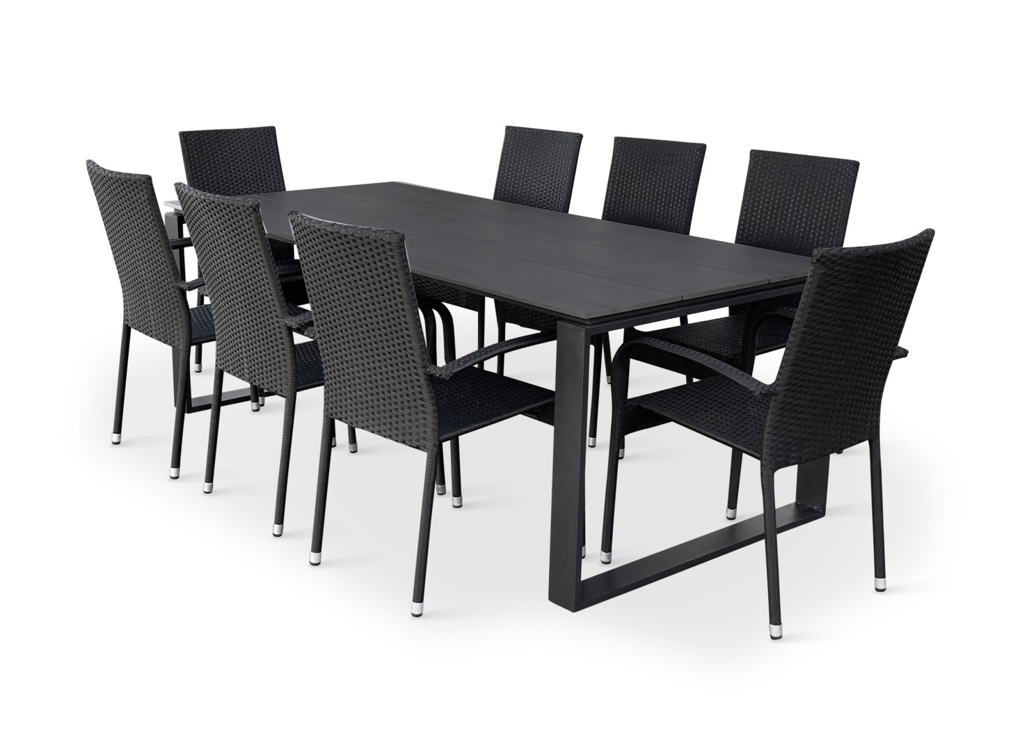 Veľká záhradná zostava KONG 8 disponuje odolnou Artwoodovou doskou stola a hliníkovou konštrukciou ratanových kresiel. Použitie hliníkovej konštrukcie pre záhradný nábytok, ktorý potrebuje odolávať zvýšenej vlhkosti, je práve tou správnou voľbou. Hliníková konštrukcia je ľahká a nehrdzavie. Vďaka tomu s takouto konštrukciou budete bez starostí. Údržba tohto materiálu je veľmi jednoduchá, čo ocení každý majiteľ. Navyše stôl je veľmi ľahký, čo uľahčí jeho prenášanie. Stoličky sú stohovateľné.V zostave sa nachádza:1 x stôl KONG XL: Rozmery (š/v/h): 210 X 74 X 100 cm.8 x kreslo ESSEN: Rozmery (v/š/h): 94 x 56 x 64 cm. Výška sedu 43 cm, šírka sedu 46 cm.Diely zostavy je možné zakúpiť aj samostatne.Dodávame v demonte.