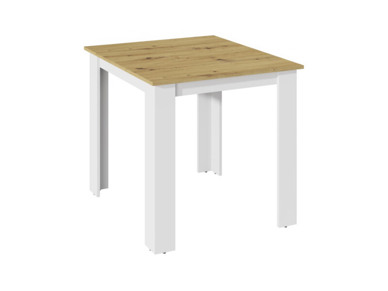 Jednoduchý jedálenský stôl KINGI bez možnosti rozkladu za výhodnú cenu.Tento stôl je vyrobený z kvalitného 16 mm LTD, ohraničený páskou ABS ako ochrana pred poškodením.Farebné prevedenie: biela matná / dub ArtisanRozmery stola š/h/v 80/80/75.Dodávame v demontovanom stave.
