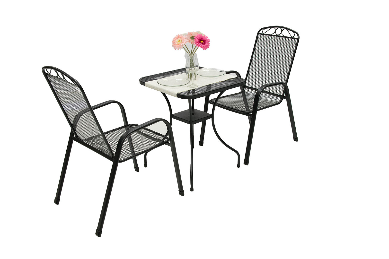 Sestava obsahuje: 1x Kovový stôl MONTREAL 60×60 cm, 2x Kovové kreslo GREY (čierna)