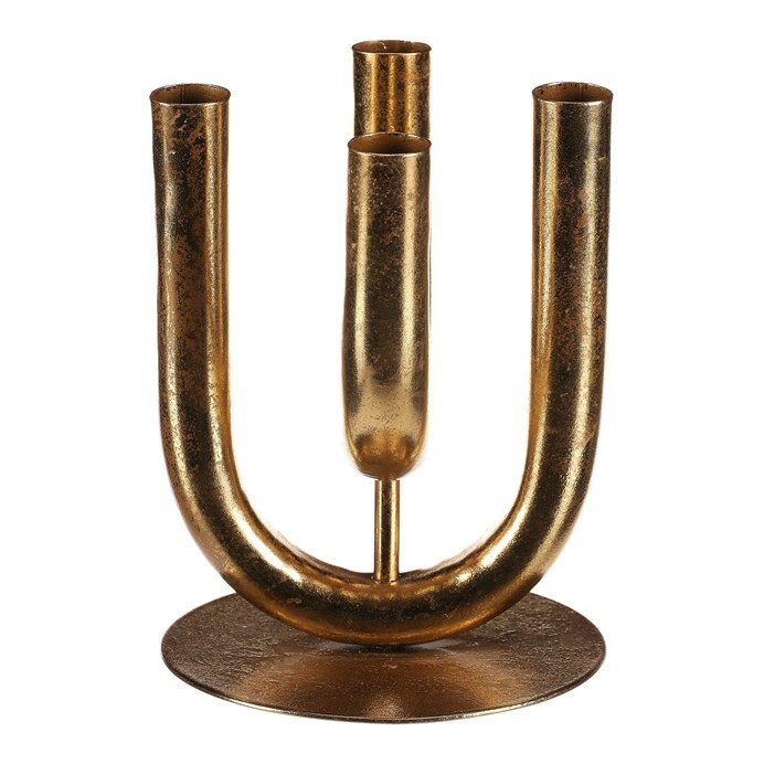 Štvorramenný kovový svietnik v zlatej farbe a uspôsobený na umiestnenie kónických sviečok, je elegantným doplnkom pre váš adventný aranžmán, prípadne aj pre celoročné použitie.Jeho unikátny dizajn v tvare dvoch prekrížených „U“ nad sebou prináša do vášho domova štýlový dotyk, ktorý zdôrazní atmosféru pokoja a pohody. S týmto svietnikom budete mať možnosť vytvoriť si nezabudnuteľné okamihy a podčiarknuť jedinečnosť každého momentu.