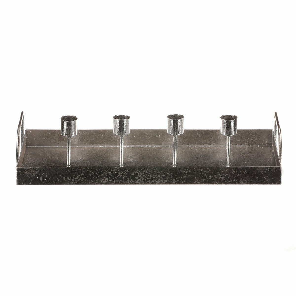 Kovový svietnik v obdĺžnikovom tvare je elegantným a praktickým doplnkom, ktorý nájde svoje miesto v každom interiéri. Je vyrobený z pevného kovu so striebornou povrchovou úpravou s jemnou patinou, ktorá mu dodáva moderný aj ľahko industriálny vzhľad. Štyri držiaky sú určené na kónické sviečky a umožňujú ich stabilné uchytenie.