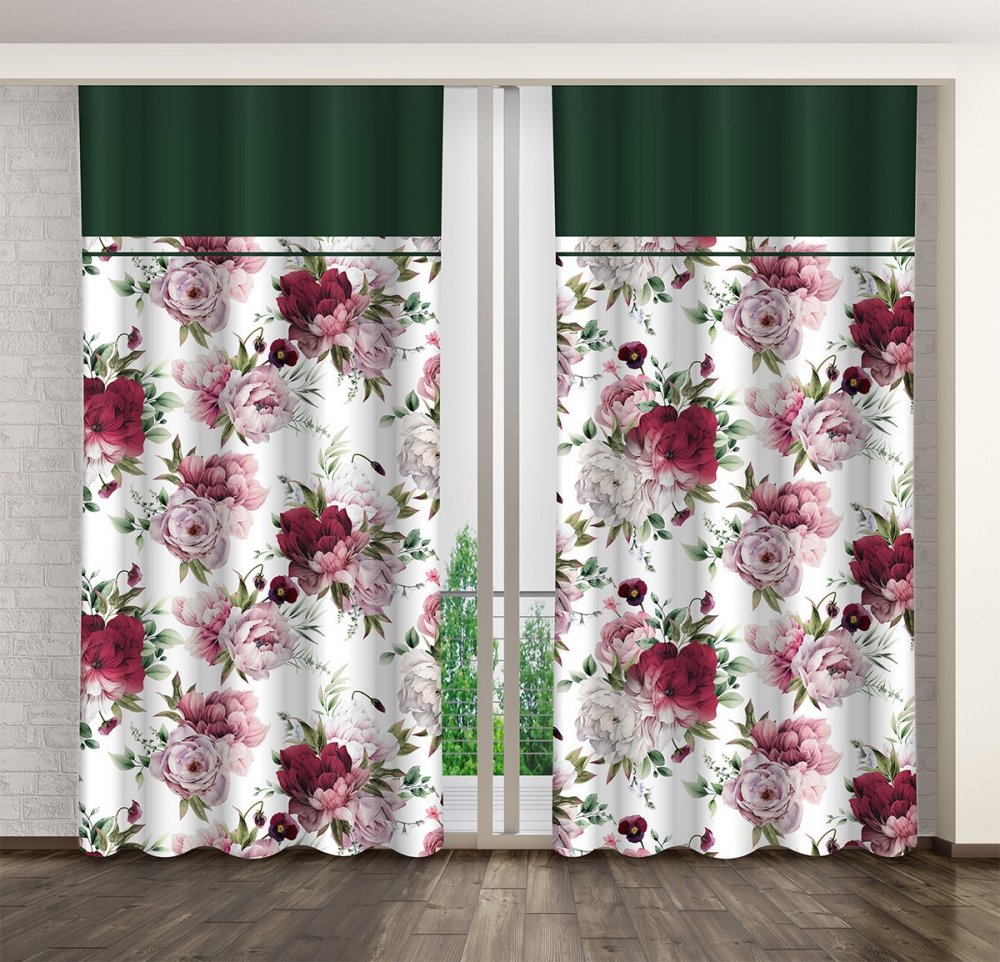 Krásny záves v bielo-zelenej kombinácii farieb s ružovými kvetinami Dĺžka: 250 cm
