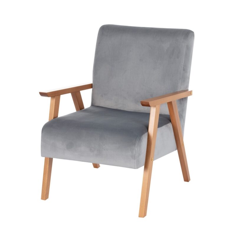 Pohodlné kreslo nadčasového dizajnu s velúrovou úpravou v sivej farbe.Toto klasické kreslo plné štýlovej elegancie vám zabezpečí plnohodnotnú relaxáciu a oddych. Drevené podrúčky a pohodlné operadlo a sedadlo, zabezpečia pohodlie pri relaxácii. Čalúnenie v univerzálnej sivej farbe sa bude dokonale hodiť do scandi, retro alebo vintage interiérov.