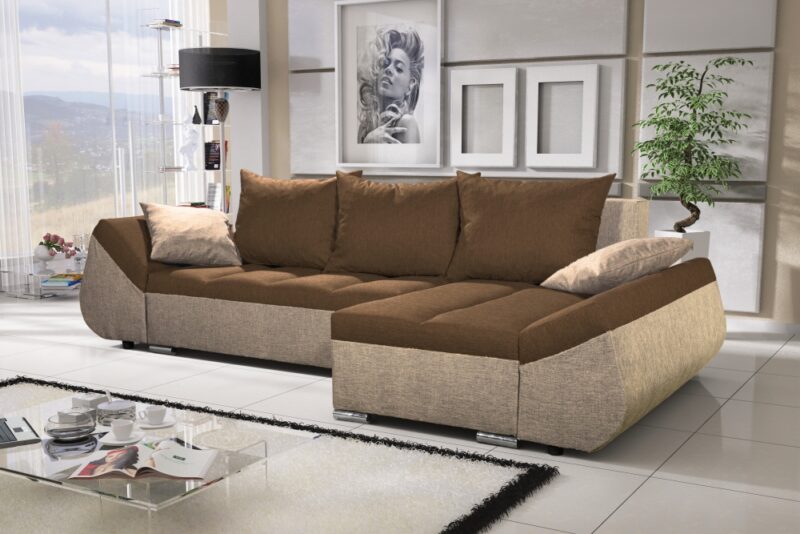Rohová sedačka KRÉTA je variabilným nábytkom. Ponúka viacero farebných kombinácii, z ktorých si určite vyberiete. Moderný dizajn sedačky dopĺňajú efektné vankúše v dvoch rozmeroch a dvoch farbách. Dvojfarebné prevedenie v spojení so zaujímavým prešívaním sedacej časti vytvára z tejto sedačky jedinečný prvok. Šikmé boky sedačky ponúkajú okrem dizajnového prvku aj praktické využitie.Sedačka má funkciu rozkladu a ponúka spaciu plochu s rozmermi 200 x 117 cm. Práve v rozklade sa dajú využiť šikmé boky sedačky, ktoré môžete využiť ako vyvýšenú záhlavkovú plochu na spanie. Týmto sa zväčší spacia plocha o 30 cm.Súčasťou sedačky sú 3 vankúše s rozmerom 71 x 51 cm a 2 vankúše s rozmerom 41 x 45 cm. Zaujímavé nízke nožičky sú v tvare valca.Sedačka má univerzálne prevedenie – variabilné umiestnenie rohu vľavo alebo vpravo.Sedačka je čalúnená v obľúbenej farebnej kombinácii krémová/hnedá, látkou Tornado 48 a Tornado 16.Konštrukcia sedačky je vyrobená v kombinácii dreva a LTD dosky. Sedacia časť je vyrobená v kombinácii zvlnenej pružiny a peny T 30.Celkový rozmer sedačky je 271 x 131 cm.Výška sedenia je 39 cm, výška operadla je 70 cm. Hĺbka sedu je 67 cm.