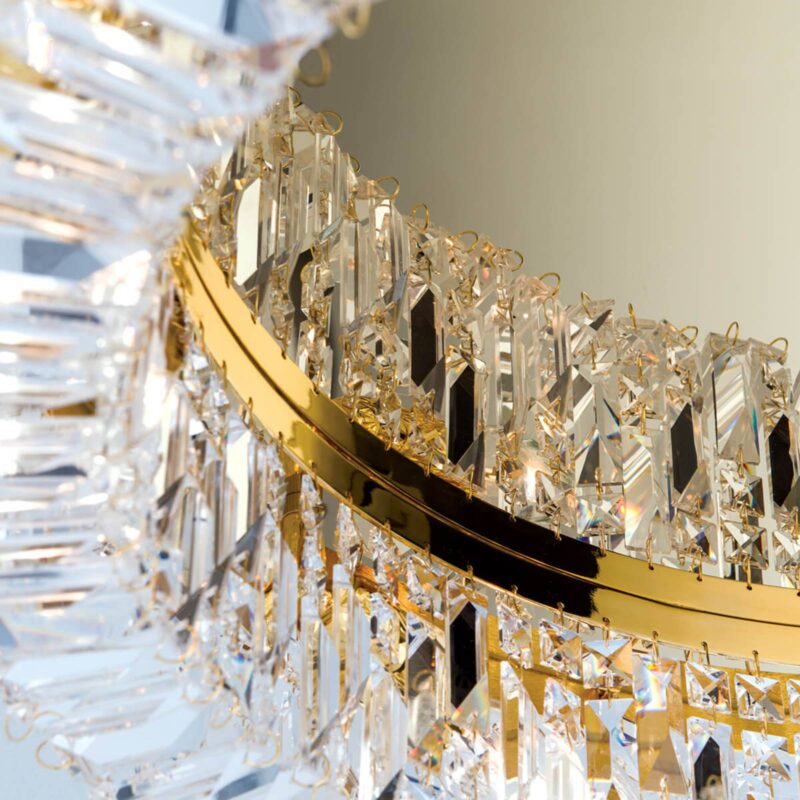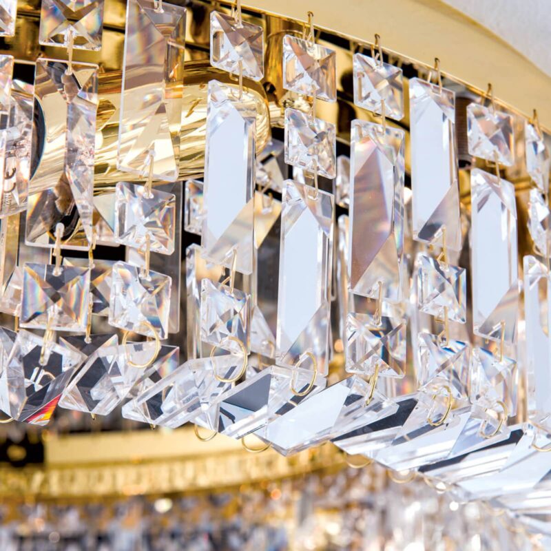 Stropné svietidlo Ring zdobené krištáľmi Schöler – 24-karátové zlátenie Exkluzívne krištáľové stropné svietidlo Ring sa prezentuje v žiarivom zlate. Základným prvkom tohto stropného svietidla je 24-karátový zrkadlový stropný panel. Nespočetné množstvo kvalitných krištáľov Schöler, ktoré sú navzájom poprepájané ručne, je upevnené na rovnako pozlátenom prstenci z masívnej mosadze, ktorý obklopuje stropný panel. Aby kryštály žiarili v celej svojej kráse, sú žiarovky umiestnené uprostred reťazí. To znamená, že krištále rôznych veľkostí sú osvetlené zo všetkých strán a môžu optimálne odrážať svetlo. Zrkadlový stropný panel plní nielen úlohu optického zväčšenia priestoru, ale tiež znásobuje odrazy krištáľov Schöler, vďaka čomu získava toto stropné svietidlo maximálny lesk. Svietidlo Ring je jedinečným osvetľovacím objektom nielen doma, ale aj vo verejných priestoroch, ktoré vyplní exkluzívnou brilantnosťou.