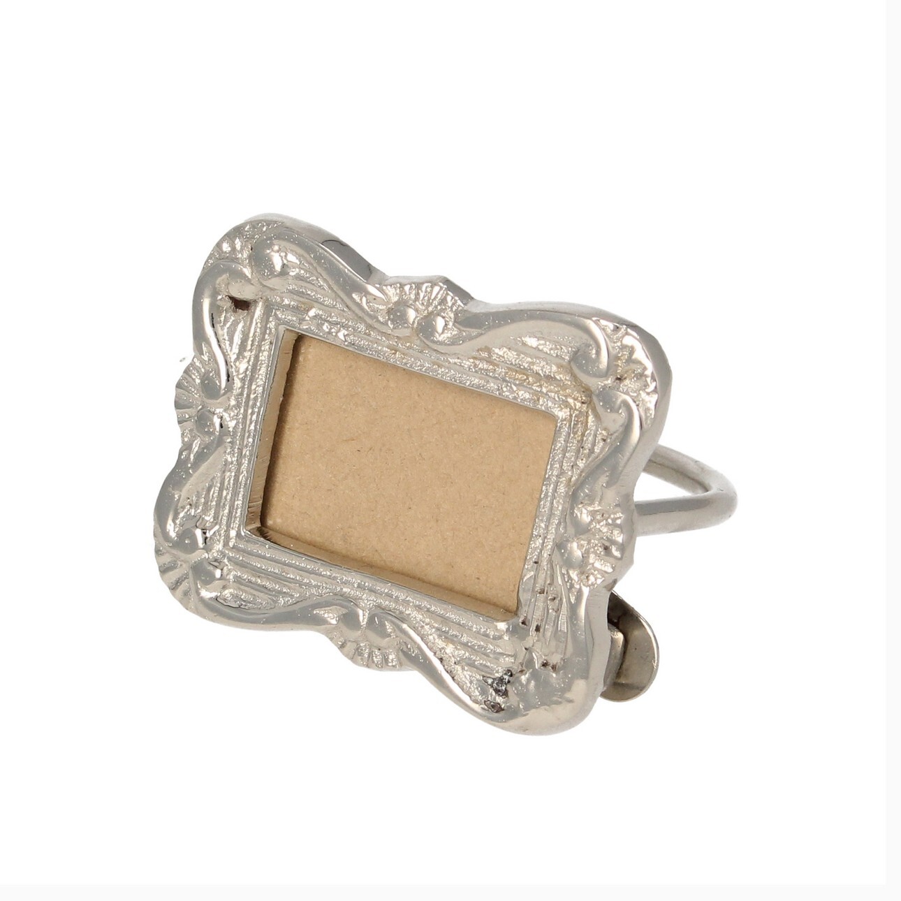 Krúžok na obrúsok s miestom na fotografiu, vyrobený z kovu striebornej farby.Jemná dekorácia efektne ozdobí stôl a dodá jedlu výnimočný charakter. Vďaka použitým krúžkom na obrúsky stôl získa rafinovaný štýl a sviatočný vzhľad. Krúžok na obrúsok Silver Frame má priestor na fotografiu, čo umožní zhotovenie nevšednej, individuálnej stolnej ozdoby, napr. počas narodeninovej oslavy alebo svadobnej hostiny.Krúžok na obrúsok bol vyrobený zo strieborného lakovaného kovu.Rozmery: šír. 4 cm, hĺ. 4 cm, výš. 4,5 cm.Cena sa vzťahuje na 1 ks.