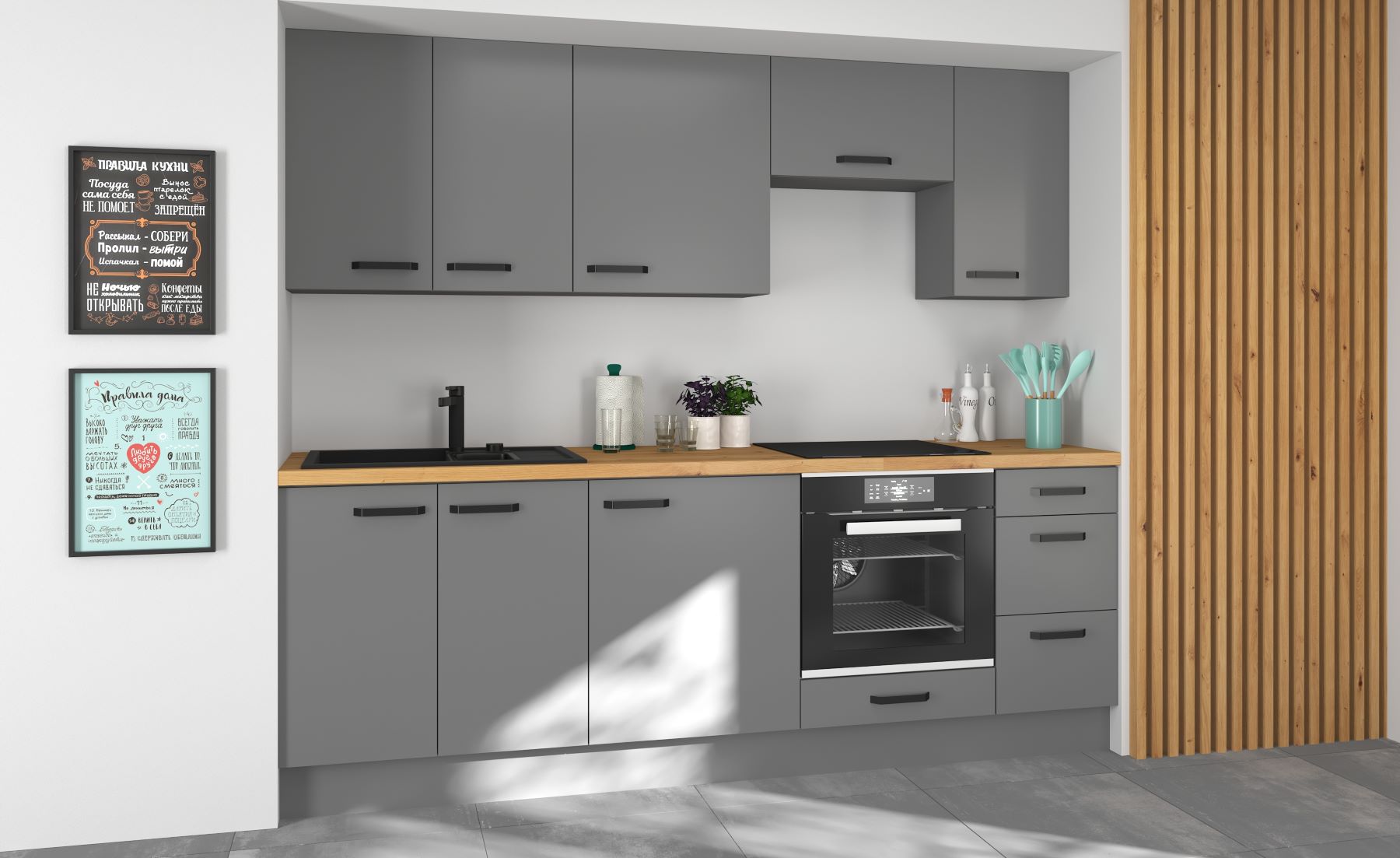 Štýlová kuchynská linka DASEN v žiadanom farebnom prevedení antracit vynikne v každom modernom interiéri. Je vyrobená z kvalitnej 16 mm hrubej LTD dosky, čierne kovové úchyty príjemne dopĺňajú jej moderný dizajn. Skrinky disponujú ABS hranami a majú funkciu tichého dovierania, nožičky sú nastaviteľné.Kuchynská zostava sa skladá:Dolné skrinkydrezová skrinka 80 cmjednodverová skrinka 60 cmskrinka na vstavnú rúru 60 cmzásuvková skrinka 40 cm Horné skrinkydvojdverová skrinka 80 cmjednodverová skrinka 60 cmjednodverová výklopná skrinka 60 cmjednodverová skrinka 40 cm.Súčasťou linky nie je drez, pracovná doska, sokel ani spotrebiče. Vďaka bohatej ponuke kuchynských skriniek z kolekcie DASEN si vyskladáte štýlovú kuchyňu podľa svojich vlastných predstáv a potrieb.Dodávame v demonte.