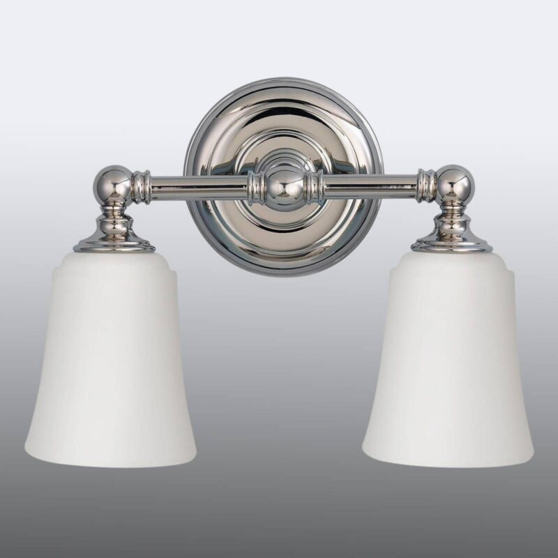 Zrkadlové svietidlo LED s dvoma lampami Huguenot Lake Nástenné svietidlo Huguenot Lake s dvoma lampami vyžarujúcimi smerom nadol, s pochrómovaným a lešteným rámom a bielymi sklenenými tienidlami vizuálne ladí s mnohými variantmi zariadenia a možno ho napríklad namontovať nad zrkadlo v kúpeľni, kde svojím mäkkým svetlom poskytuje žiarivo krásne okolité osvetlenie. Je vybavený ochranou proti striekajúcej vode (IP44) a dodáva sa s dvoma žiarovkami LED G9, ktoré vyžarujú teplú bielu farbu svetla.