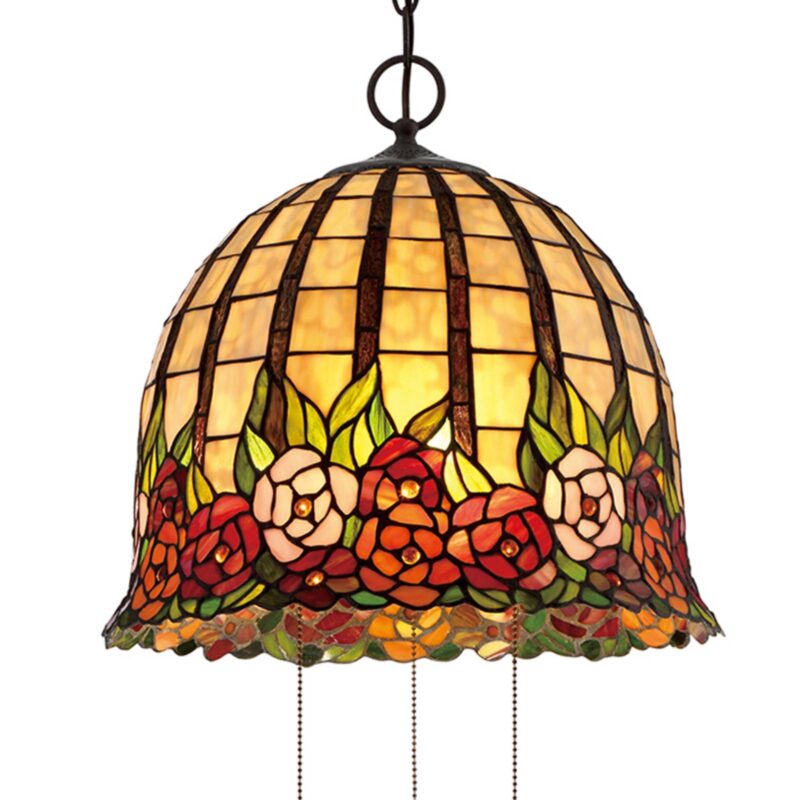 Rosecliffe – prívesková lampa Tiffany s kvetinovým vzorom a tromi ťahovými spínačmi Rosecliffe je elegantná prívesná lampa vyrobená zo známeho skla Tiffany, ktoré sa vyznačuje najmä umeleckou kompozíciou rôznych sklenených prvkov. Rovnako ako táto lampa, aj tienidlo na lampu je konštruované v tvare kupoly a v dolnej časti zdobené ružovými vzormi. To dodáva vzhľadu úžasne dekoratívnu aj romanticky hravú notu. Tieto tri svetelné zdroje je možné zapínať oddelene od seba pomocou troch ťahových spínačov, ktoré visia z tienidla v spodnej časti.