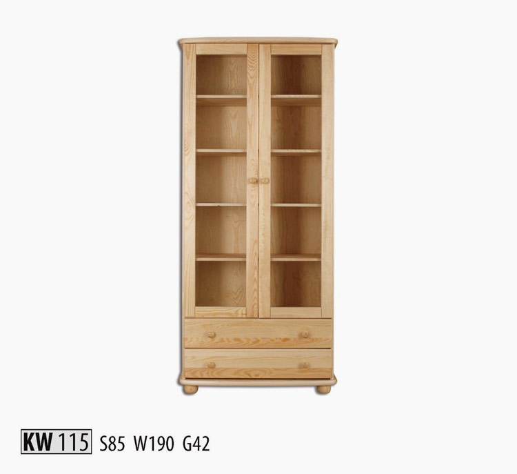 KW115 Vitrína v modernom prevedení. Farebné prevedenie: prírodná borovica. Je dvojdverová, dvierka sú presklené. Vo vnútornej časti sa nachádza 8 políc. V spodnej časti sa nachádzajú 2 praktické zásuvky. Za príplatok ponúkame možnosť namorenia na odtieň dub, jelša a orech. Vhodná do obývačky, či pracovne. Dodávame v demontovanom stave.