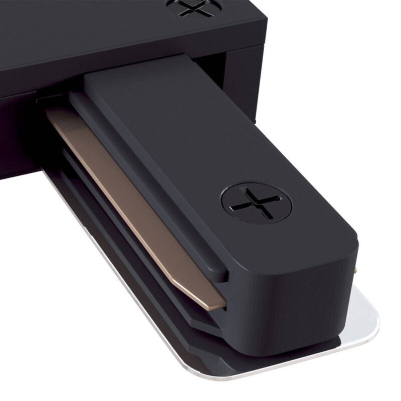 Dráha konektora L pre jednofázové systémy v čiernej farbe Pomocou tohto jediného prvku možno navzájom spojiť dve koľajnice v uhle 90 °.