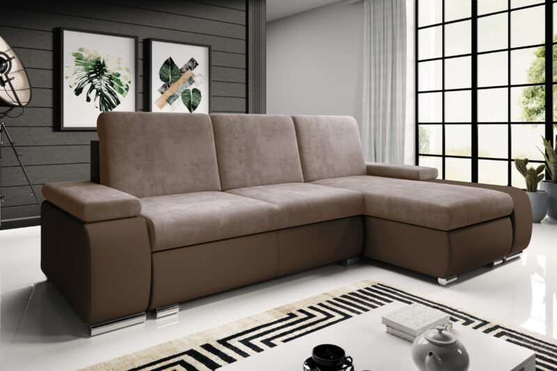 Sedačka LADA patrí medzi menšie rohové sedačky. Jednoduché línie sedačky sú doplnené elegantným zaoblením a štýlovými lesklými nožičkami. Kombinácia látok a farieb umocňuje celkový vzhľad a dodáva mu jedinečnosť. Vyššie opierky chrba zaručia pohodlné sedenie.Sedačka maximálne využíva priestor, čo ocení každý majiteľ. V spodnej časti nájdete 2 praktické úložné priestory s rozmerom 130 x 63 x 21 cm a 131 x 61x 21 cm. Za pomoci mechanizmu MOSS, získate praktickú ložnú plochu s rozmerom 140 x 203 cm, vhodnú na príležitostné spanie.Pohodlie pri oddychu a leňošení zaručí kombinácia bonellovej pružiny a PUR peny typu T30. Sedačka je čalúnená kombináciou eko-kože Madryt 124 a látky Paros 03. Prevedenie nôh sedačky je metal chrom, ich výška je 5 cm.Celkové rozmery (š/v/h): 255 x 90 x 144 cm. Výška bez opierok je 75 cm, hĺbka sedenia je 55 cm, výška sedenia je 42 cm. Prevedenie rohu je univerzálne, takže priamo na mieste si viete zvoliť sedačku s ľavým/pravým rohom.