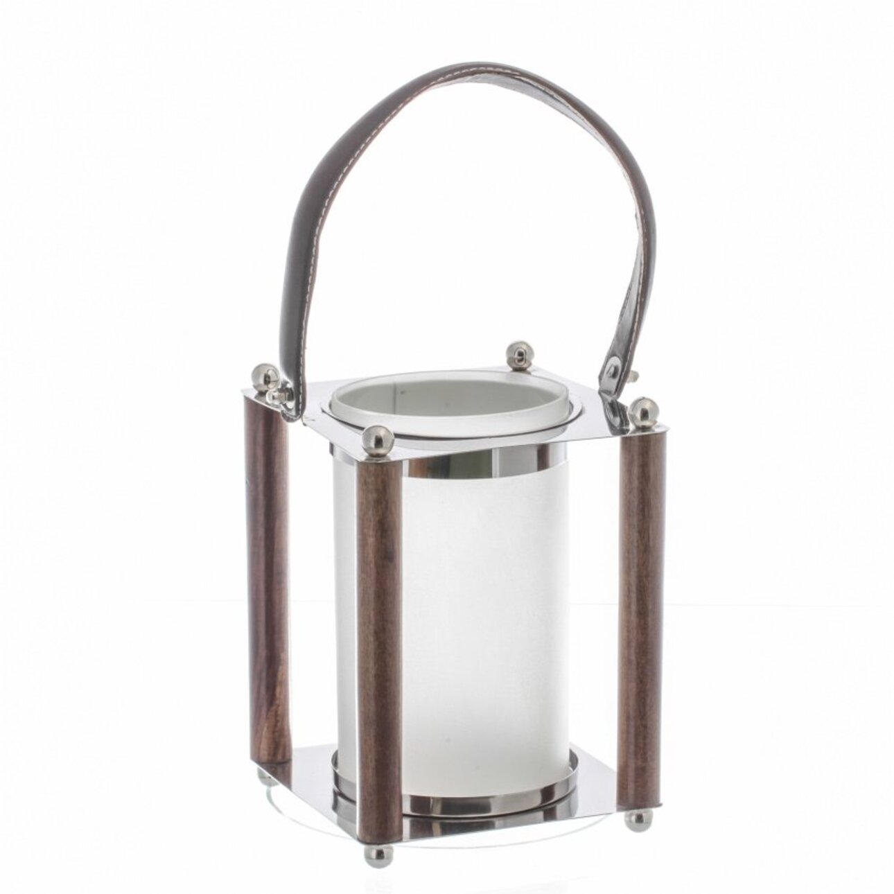 Dizajnový otvorený lampáš Elegantný dekoračný lampáš z dreva, kovu a skla.Vnútro tvorí chrómovaný sklenený valec posadený na kovovom podklade.Rukoväť lampáša je z eko kože, zabezpečuje bezpečnú manipuláciu a prenos.Rozmery: podstava: šírka 18cm, dĺž 18cm, výš. 25cm, valec- priemer 12,5cm, výš. 22cm