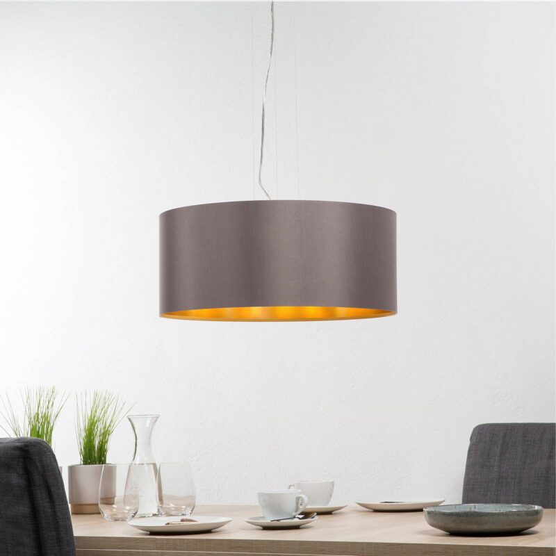 Vkusné závesné svietidlo Maserlo s textilným tienidlom kapučínovej farby Týmto závesným svietidlom možno štýlovo osvetliť obytné priestory. 22 cm vysoké okrúhle tienidlo je zvonka kapučínovej a znútra zlatej farby. Práve v prípade svetlo zariadených interiérov na seba svietidlo v miestnosti príjemne púta pozornosť. Závesný systém má dĺžku 110 cm.