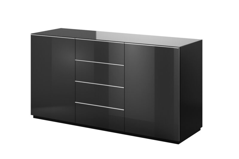 Komoda LEANA patrí do moderného a nadčasového sektoru HELIO. Zaujme vás svojim štýlovým vzhľadom a čistými jednoduchými líniami.Je vyrobená z kvalitnej LTD dosky, ktorá je nenáročná na údržbu. Farebné prevedenie: čierna, čierne sklo.Komoda je dvojdverová. V strednej časti sa nachádzajú štyri praktické zásuvky. Rozmery (š,v,h): 160 x 80 x 48 cm.Komoda je v štandarde na podstavci. Môžete si k nej dokúpiť nožičky (viď. doporučené produkty)Obývací sektor LEANA sa svojím prevedením hodí do moderných a nadčasových interiérov. Je v minimalistickom a zároveň elegantnom prevedení. Z prvkov sektoru LEANA si môžete zariadiť vašu obývačku či jedáleň podľa vašich prestáv.Dodávame v demontovanom stave.