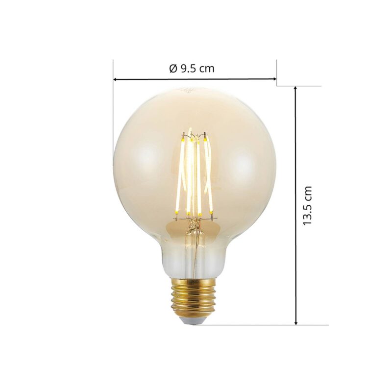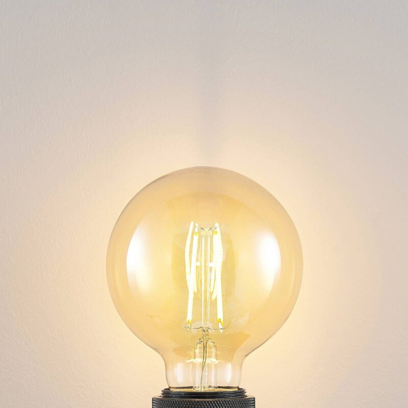Globe LED žiarovka E27 G95 filamentová 6,5 W, jantárový odtieň, stmievateľná Globe LED žiarovka s päticou E27 je charakterizovaná nielen svojím nádherným vzhľadom, ale aj pohodlným osvetľovacím efektom. Pomocou existujúceho nástenného vypínača a bez pridaného stmievača je možné diódy LED s teplou bielou farbou svetla 2 500 K prepínať v troch úrovniach jasu (100%, 55%, 20%). Dokonalá žiarovka pre otvorené svietidlá alebo trendy svietidlá s objímkou bez tienidla na lampu.