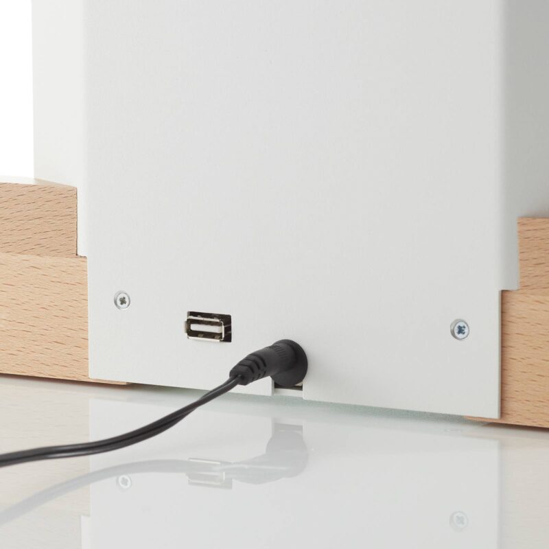 Stolná LED lampa Luxi s integrovanou stanicou pre mobilný telefón, stmievateľná Stolná LED lampa Luxi sa prezentuje ako inteligentný riešiteľ problémov a zdroj svetla v jednom. Luxi má praktický držiak na mobilný telefón. Pripojenie USB umožňuje nabíjanie mobilného telefónu v stanici. Zároveň sa vytvára atmosféra, pretože LED diódy sú skryté za oceľovým krytom a do miestnosti vyžarujú svetlo len nepriamo. Intenzitu svetla možno stlmiť v troch stupňoch pomocou dotykového spínača na drevenej základni.