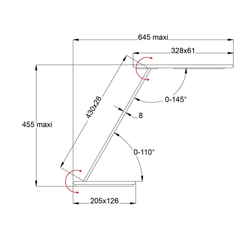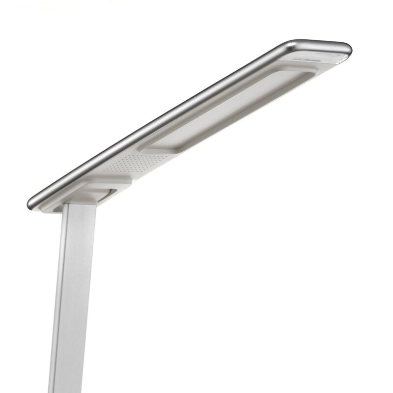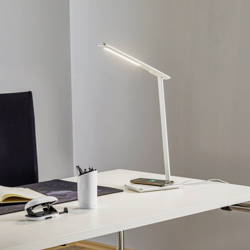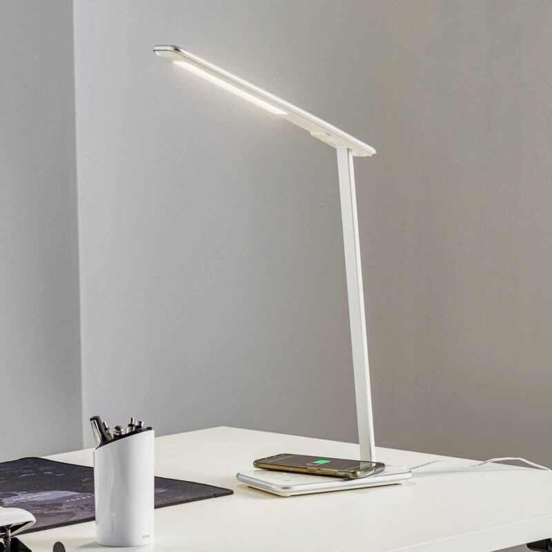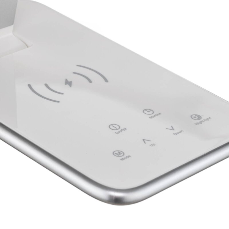 Elegantná stolová LED lampa Orbit s futuristickou technológiou Stolová LED lampa Orbit zaujme nielen svojím zmenšeným elegantným dizajnom, ale aj modernou technológiou. V základni lampy je indukčná základňa, pomocou ktorej možno pohodlne a bez otravných káblov nabíjať smartfón. Ak mobilný telefón nemá funkciu indukčného nabíjania, k výstupu USB možno alternatívne pripojiť nabíjací kábel. Lampu možno nastaviť na päť rôznych úrovní jasu a tri rôzne farby svetla. Integrovaný snímač umožňuje aj automatické prispôsobenie svetelným podmienkam. Vďaka funkcii nočného svetla môže lampa v noci slúžiť ako orientačné svetlo, a ak je aktivovaná funkcia stop, po 60 minútach sa automaticky vypne. Technické údaje – Indukčná základňa QI – Výstup USB – Svetelný senzor – Variabilná farba svetla od teplej bielej po denné svetlo (2 800 K – 5 700 K) – Pamäťová funkcia – Funkcia Stop (60 minút) – Funkcia nočného svetla – Stmievateľné