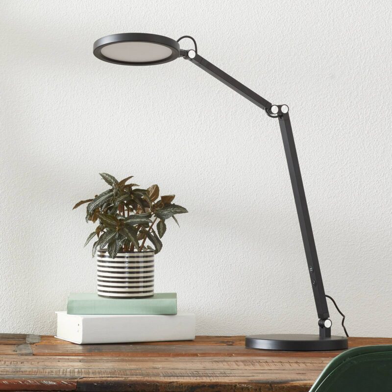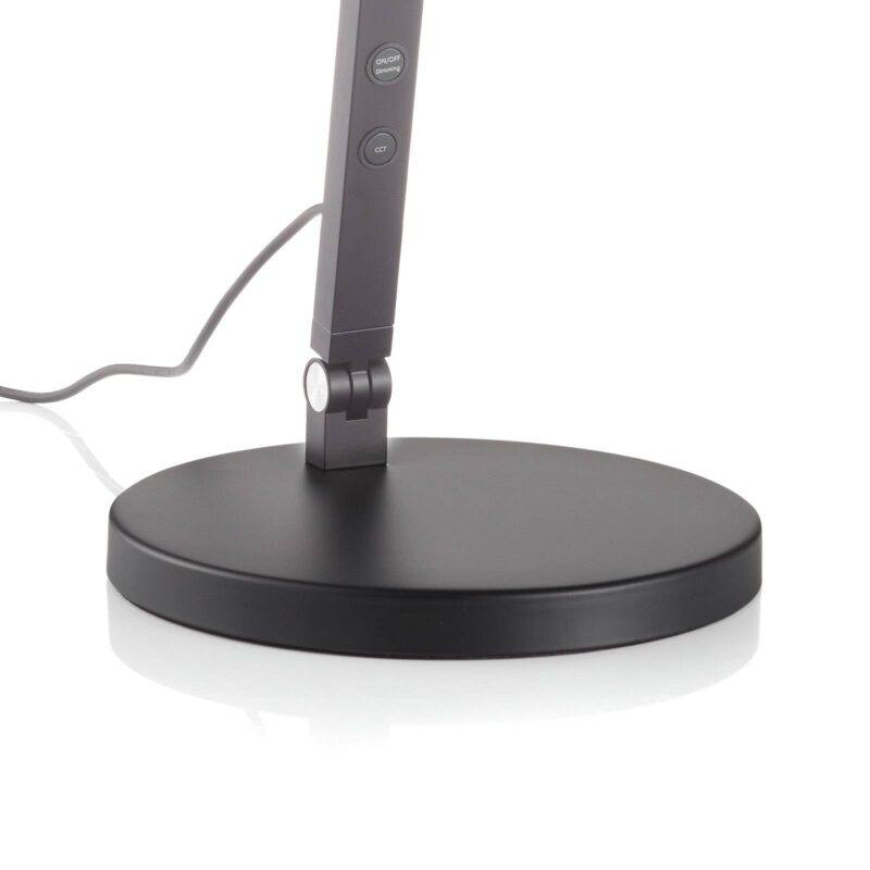 Stolná LED lampa Regina – nastaviteľná, stmievateľná a s nastaviteľnou farbou svetla Stolná LED lampa Regina je užitočný a flexibilný pomocník na pracovný stôl a stôl v obývačke. Niekoľko kĺbov umožňuje podľa potreby nastaviť výčnelok a výšku rámu, ktorý je podopretý okrúhlou základňou, a orientáciu kruhového tienidla. To však nie je všetko: dve ovládacie plochy na spodnej časti rámu umožňujú reguláciu svetelného výkonu v piatich stupňoch a nastavenie teploty farby v troch stupňoch od teplej bielej 2 700 K po univerzálnu bielu 5 000 K. Regina tak poskytuje správne svetlo na pokojné čítanie novín až po sústredenú prácu v domácej kancelárii.