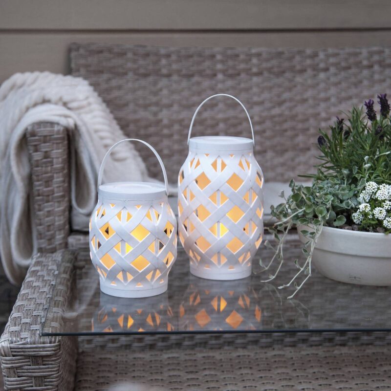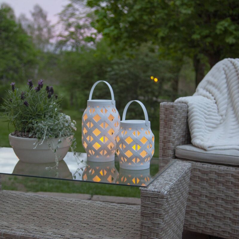 LED lampáš Flame Lantern s efektom mihotavého plameňa LED lampáš Flame Lantern je obzvlášť dizajnový a dekoratívny. Plastový vonkajší kryt je tvorený z sieťoviny s mnohými medzerami, cez ktoré je vidieť vnútorný difúzor. Vyzerá to ako plameň sviečky a zabudované LED napodobňujú efekt plameňa. Flame Lantern je napájané tromi batériami AAA (nie sú súčasťou balenia – pozri príslušenstvo) a na vrchnej časti má praktickú rukoväť, vďaka ktorej je toto svietidlo prenosné. LED dekoratívne svietidlo môžete použiť buď v interiéry alebo v chránených vonkajších priestoroch a vykúzliť tak očarujúce chvíle. Pomocou funkcie časovača je možné zapnúť nepretržité svetlo alebo svetlo na šesť hodín pomocou integrovaného spínača. Môžete ho tiež vypnúť.