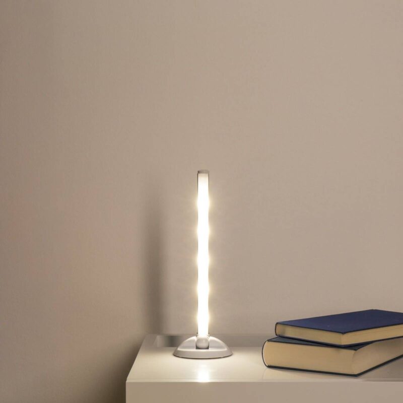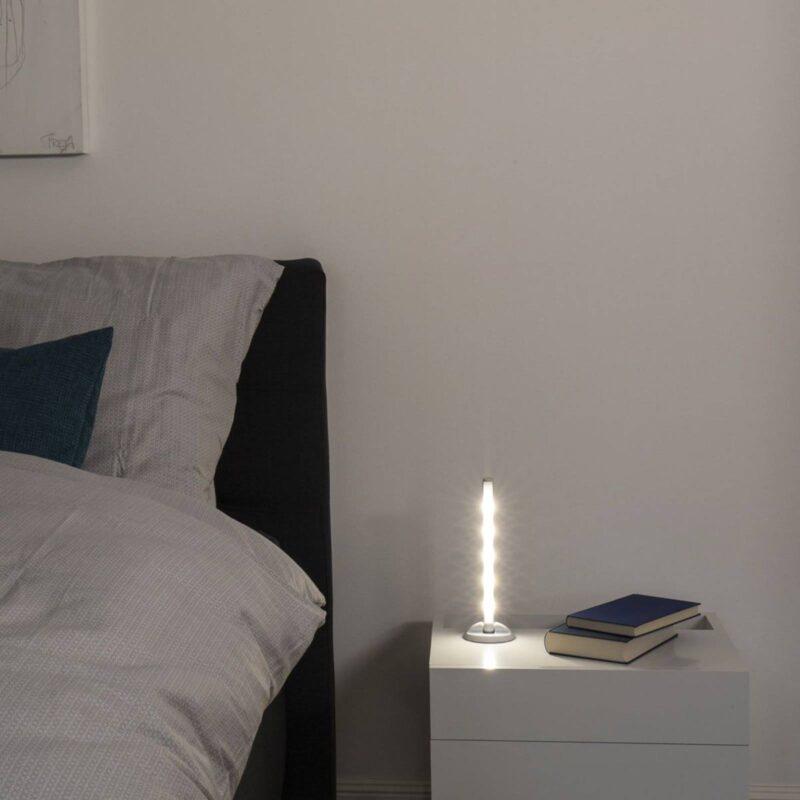LED svietidlo na batérie na stôl alebo na stenuSvietidlo LED na batérie, a teda úplne bez pripojenia k elektrickej sieti, sa dá používať ako stolová lampa aj ako nástenné svietidlo, pretože podstavec sa dá pripevniť na bočnú stranu lampy a vďaka samolepiacej zadnej strane aj pripevniť na stenu. Svietidlo je napájané 4 batériami AAA (sú súčasťou balenia), je vybavené vypínačom a 2-stupňovým stmievačom a vyžaruje univerzálne biele svetlo.