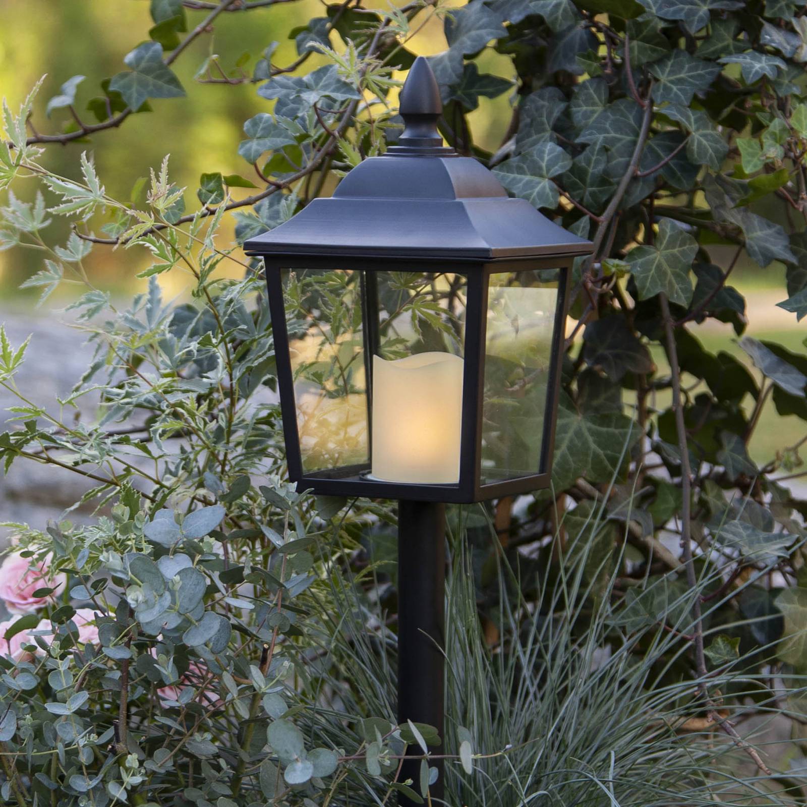 Čierna LED náhrobná lampa Flame Lantern s funkciou časovača Flame Lantern je štýlový, diskrétny a minimalistický. Skladá sa z lampiónového tienidla s LED sviečkou z krémového plastu a z jemnej tyče so zemným hrotom. Vďaka napájaniu z batérie je možné ho umiestniť veľmi flexibilne a je prenosný. Sviečka poskytuje teplé, jemne blikajúce svetlo, ktoré vyzerá veľmi prirodzene a vytvára štýlový svetelný prízvuk. Vstavaný časovač vám umožňuje nastaviť dobu svietenia na šesť hodín a potom vypnutie svetla na 18 hodín. Náhrobná lampa je napájaná batériou CR2450 (súčasťou balenia).