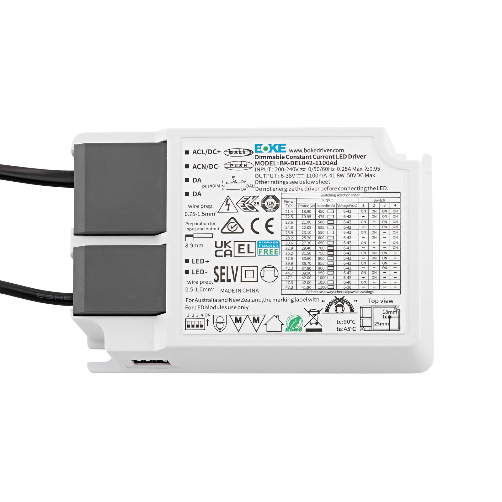 LED ovládač Powerline Panel CC, DALI, 42 W, 450 – 1 100 mA Konštantný prúdový ovládač Powerline Panel CC DALI zabezpečuje napájanie LED panelu Sigor Fled Backlit. Ovládač možno ovládať a stmievať pomocou zbernice DALI. Napájacia jednotka je certifikovaná podľa ENEC a TÜV a zabezpečuje osvetlenie bez blikania. Pripojené káble minimalizujú nároky na inštaláciu. Technické údaje – Sieťové napätie: 230 V – Frekvencia: 50 / 60 Hz – Rozsah striedavého napätia: 200 – 240 V – Rozsah jednosmerného napätia: 6 – 38 V – Menovitý prúd (230 V, 50 Hz, plné zaťaženie): 1.100 mA – Výkon (230 V, 50 Hz, plné zaťaženie): 47,3 W – Výstupný prúd: 0,25 A – Výstupné napätie: 42 V – Výstupný výkon: 42 W – Rozsah konštantného prúdu: 450 – 1 100 mA – Odolnosť proti skratu: áno – Teplotná ochrana: áno – Teplotný rozsah: -20 až 45 °C – Dobrá stabilita spínania: 50 000 spínacích cyklov