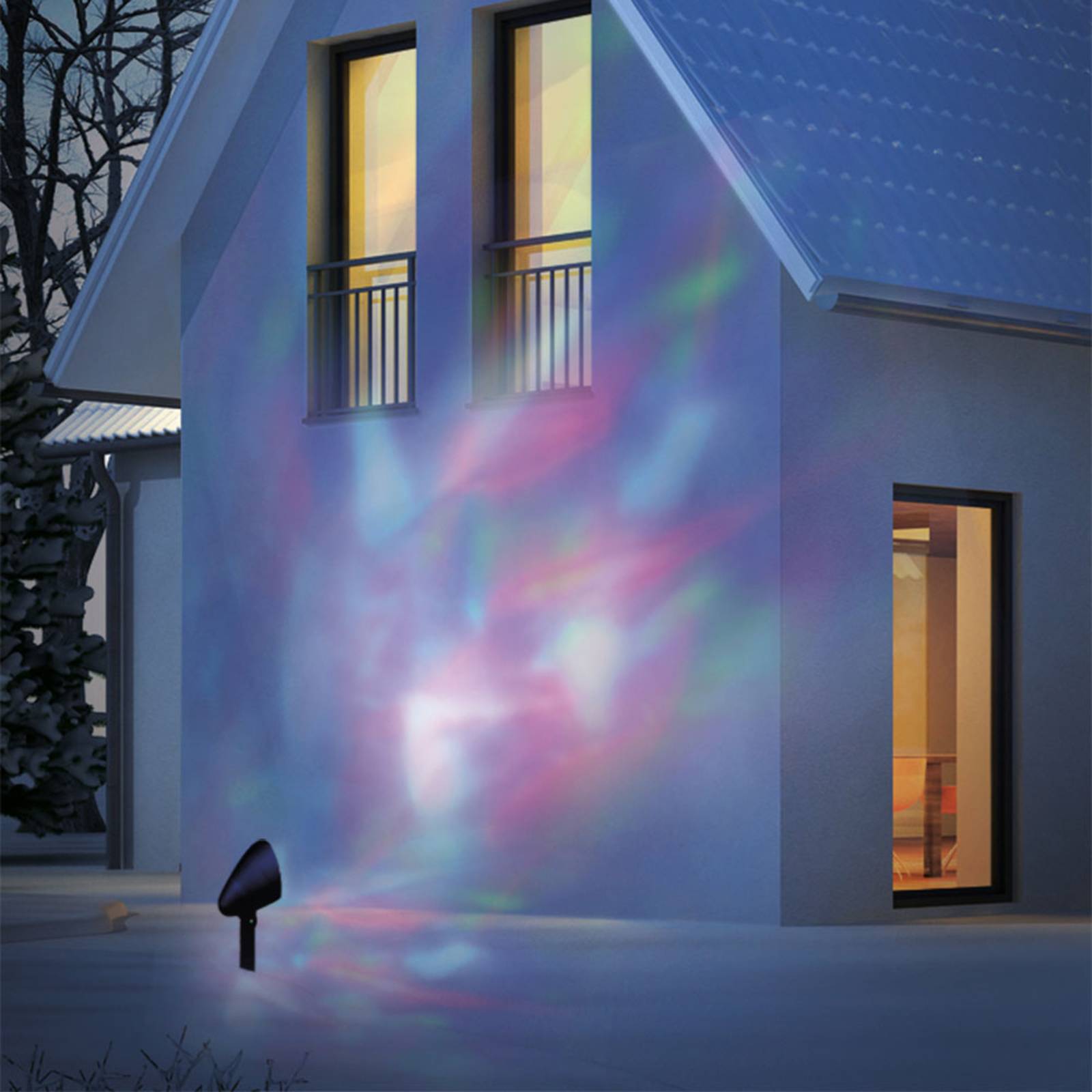 LED projektor Disco s rotujúcimi svetelnými efektmi Tento LED projektor Disco na osvetlenie fasády prináša farby do hry! Vďaka otočnej hlave svietidla poskytuje pestré farebné svetelné efekty na fasádach alebo v záhrade. Konštrukcia z PVC je odolná voči poveternostným vplyvom. Či už na záhradných oslavách, alebo všeobecne počas tmavého obdobia: LED projektor Disco vytvorí tú zvláštnu atmosféru.