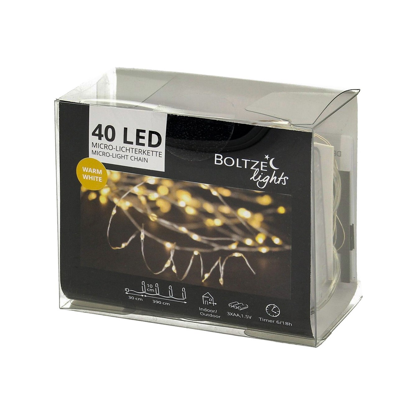 LED reťaz na 3 batérie AA 1,5 V s časovačom 6/18 h. Výrobok možno používať v interiéri aj exteriéri.Rozmery: šírka 1 cm, dĺžka 420 cm, výška 1 cm.