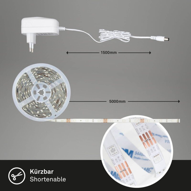 Inteligentný, skrátiteľný pás LED s diaľkovým ovládaním – vrátane napájacieho vedenia, vodiča a diaľkového ovládača – 5 m dlhá samolepiaca páska sa dá skrátiť každých 10 cm – Dá sa ovládať prostredníctvom aplikácie Tuya, Amazon Echo a Google Home – Je možné zvoliť rôzne farebné programy / svetelné efekty