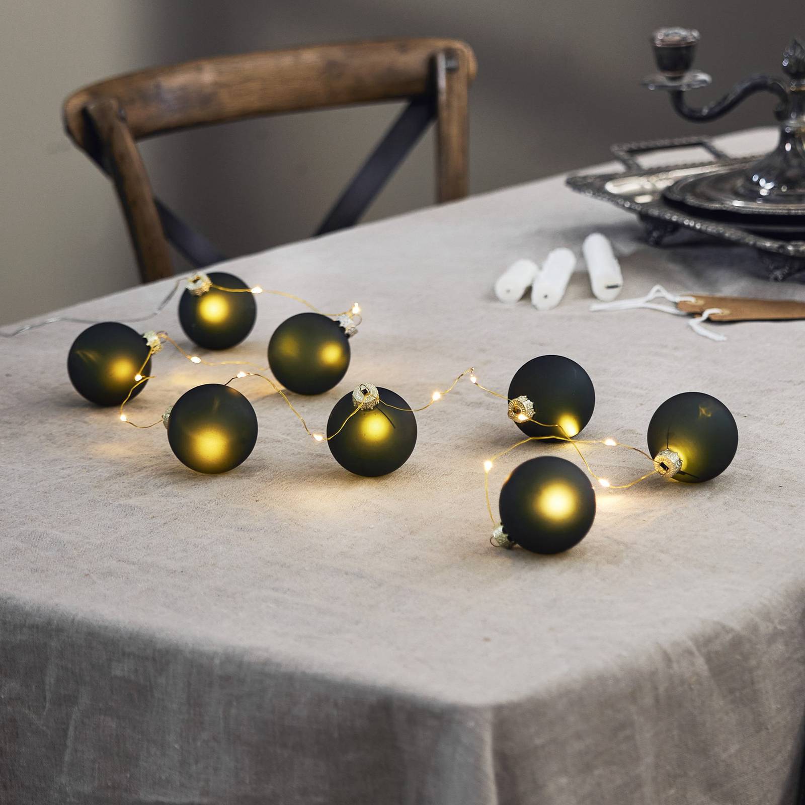 Svetelná reťaz Bliss LED na batérie s ôsmimi tmavozelenými sklenenými guľami Svetelná reťaz Bliss LED je atmosférická svetelná dekorácia do interiéru, najmä počas vianočného obdobia. Pozdĺž reťaze je zoradených osem guľovitých tmavozelených pohárov, z ktorých každý obsahuje teplú bielu LED diódu. Napájanie zabezpečujú tri batérie AA (exkluzívne), ktoré sa vkladajú do priehradky na batérie na konci reťaze. Funkcia časovača (6 h zapnuté, 18 h vypnuté) umožňuje automatické zapínanie.