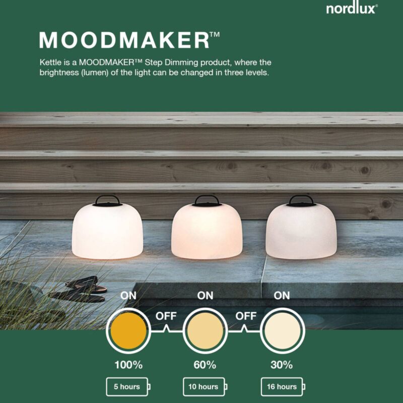 Trojnožková LED stojacia lampa Kettle s nabíjateľnou batériou a 3-stupňovým stmievačom Trojnožkovú LED stojacu lampu Kettle možno použiť na vytvorenie čarovného vonkajšieho priestoru doma na terase alebo balkóne, ako aj vo vonkajších reštauračných priestoroch alebo vonkajších zariadeniach iných komerčných zariadení bez potreby pripojenia k elektrickej sieti, pretože svetlo je vybavené nabíjateľnou batériou a nabíjací kábel je súčasťou balenia. Teplé biele LED diódy zabudované v bielom plastovom tienidle sa dajú niekoľkokrát zapnúť a vypnúť, aby sa vytvorilo jasnejšie alebo tlmenejšie svetlo v závislosti od nálady. Keď je batéria plne nabitá, svetlo vydrží svietiť približne päť hodín pri nastavení 100 %, až 10 hodín pri nastavení 60 % jasu a 15 hodín pri nastavení 30 % jasu. Stojaciu lampu Kettle LED s trojnohým rámom vytvorili dánski dizajnéri Kaspar Meldgaard a Nikolaj Duve vo svojom dizajnérskom štúdiu Says who, ktoré vzniklo v roku 2010. Od založenia štúdia tvoria obaja dizajnéri, ktorí sú nielen kolegami, ale aj priateľmi, úspešný tím, ktorý sa venuje škandinávskemu dizajnu a navrhuje aj nábytok.