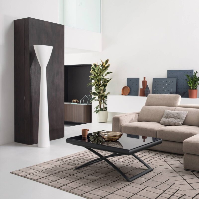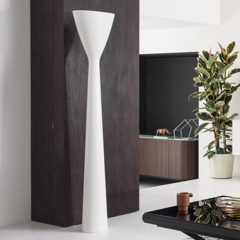 Dizajnové stropné svietidlo Carrara na nepriame osvetlenie Na prvý pohľad Carrara sotva vyzerá ako svietidlo, ale skôr ako socha. Jednofarebné telo vyrobené z polyuretánu je navrhnuté ako valec, ktorý sa v spodnej časti smerom k vrcholu zužuje. V hornej časti sa obvod telesa opäť zväčšuje a pri vertikálnom pohľade nadobúda oválny tvar. Svetlo z integrovaných LED diód vyžaruje široko nahor, takže príjemne osvetľuje miestnosť ako nepriame osvetlenie cez strop alebo susednú stenu. Svetelný výkon možno regulovať pomocou nožného stmievača na prívodnom kábli. Stojaciu lampu s LED diódami, ktorú navrhol Alfredo Häberli, možno kombinovať s klasickými aj modernými koncepciami nábytku.