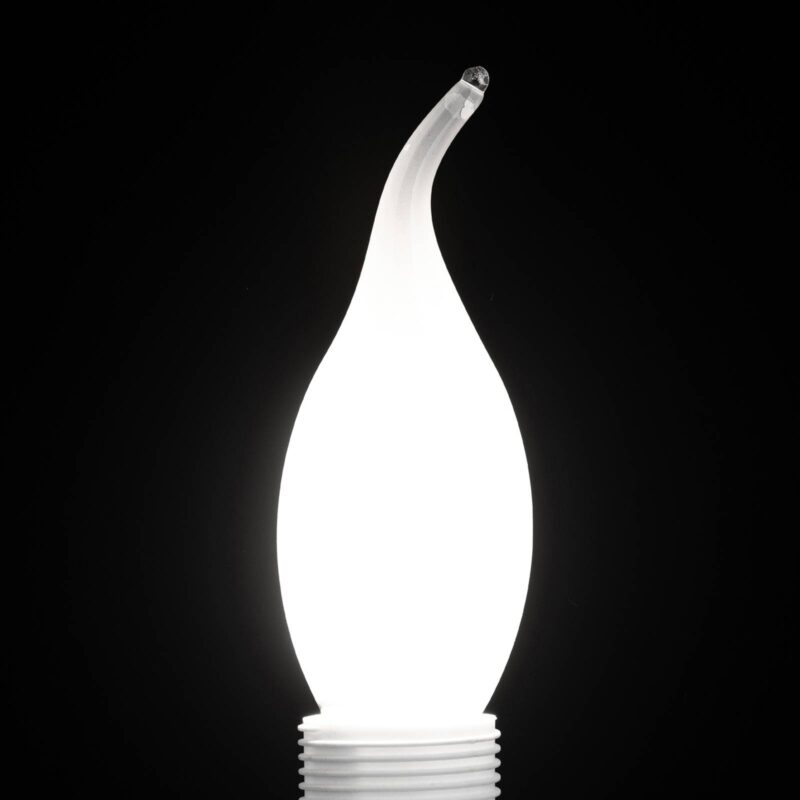 LED vetruvzdorná lampa na sviečku E14 4,5 W, teplá biela 2 700 K, stmievateľná, matná Vďaka krásnemu tvaru, matnému sklu a LED diódam zabudovaným ako vlákna je táto vetruvzdorná lampa na sviečku ideálnym zdrojom svetla v lustroch alebo nástenných a stolových lampách, ktoré boli vytvorené ako svietnik. Svetlo vyžaruje s nízkym oslnením cez matné sklo do okolia s uhlom vyžarovania 360°. Svietidlo je možné stmievať pomocou stmievača s fázovým rezom.
