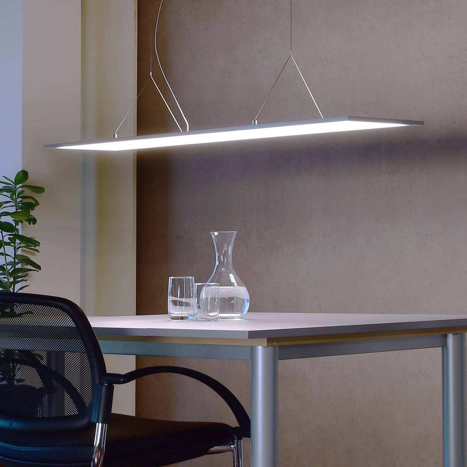 Svetelne intenzívny panel LED: Závesné svietidlo LED s priamym a nepriamym rozptylom svetla a dodatočným výberom farby svetlaToto moderné závesné svietidlo LED je vybavené priehľadným hranatým difúzorom, ktorý je po vypnutí takmer priehľadný. Zabezpečuje priame aj nepriame rozloženie svetla a ponúka obzvlášť neoslňujúce a celoplošné osvetlenie, ktoré sa veľmi dobre hodí do kancelárskych priestorov. K tomu prispieva aj hodnota UGR < 19. Okrem toho môžu LED diódy svietiť v dvoch rôznych farbách svetla vďaka zabudovanému prepínaču. V závislosti od oblasti použitia je možné vybrať si medzi teplým bielym a univerzálnym bielym svetlom. Mimoriadne vysoké farebné podanie vytvára veľmi prirodzené farby.- Stmievateľné prostredníctvom fázového vypínania alebo zapínania- Vysoké farebné podanie (Ra 90)- UGR < 19- Možnosť voľby teplého bieleho (3 000 K, 5 600 lm) alebo univerzálneho bieleho svetla (4 000 K, 6 100 lm) vďaka prepínaču
