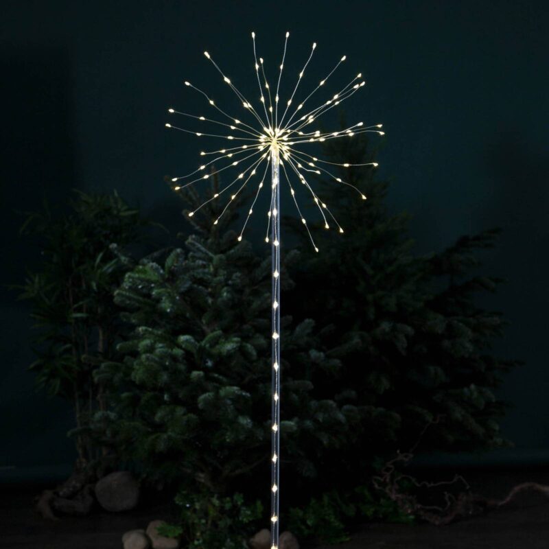 Teplé biele LED dekoratívne svetlo Firework Outdoor s batériovým napájaním LED dekoratívne svetlo Firework Outdoor je možné umiestniť kdekoľvek bez ohľadu na zásuvku, pretože je napájané batériami. Tieto napájajú 152 teplých bielych LED diód, ktoré sú rovnomerne rozložené na jednotlivých vzperách svetla. V tme sa objaví fascinujúci obraz, ako snímka vybuchujúceho ohňostroja. Integrovaný časovač umožňuje, aby sa svietidlo Firework Outdoor rozsvietilo po dobu 6 hodín od prvého zapnutia, a potom sa vyplo na 18 hodín, kým sa automaticky znovu nezapne. – batérie 4 x A nie sú súčasťou balenia; môžete ich zakúpiť ako príslušenstvo