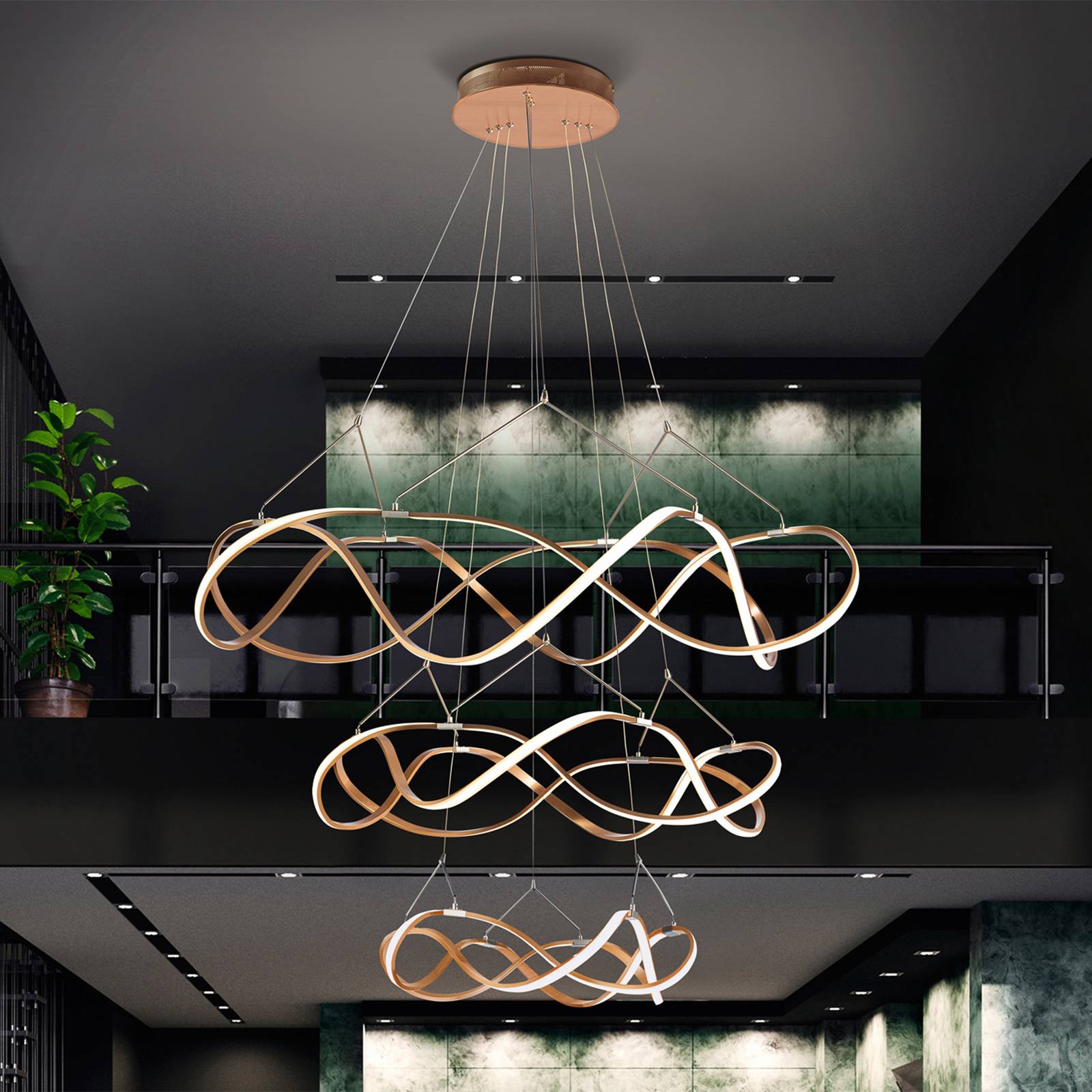 LED závesné svietidlo Molly v impozantnej veľkosti, stmievateľné pomocou triaku Molly je 3-úrovňové svietidlo LED vyrobené z hliníka s ružovozlatým povrchom a chrómovými detailmi. Prepletené svetelné prvky z úzkych kovových pásikov s jednostrannými difúzormi z opálového silikónu visia z okrúhleho vrchlíka na troch úrovniach, za ktorými sú umiestnené teplé biele LED pásiky. Tento výrobok obsahuje LED ovládače so stmievaním TRIAC a 0-10 V. Jeho súčasťou je stmievacia súprava s prijímačom a diaľkovým ovládaním. Svietidlo sa môže používať aj so stmievačom TRIAC alebo 0-10V nástenným stmievačom. Toto svietidlo sa dodáva s prepínačmi GRAVITY na zlepšenie montáže na strop.