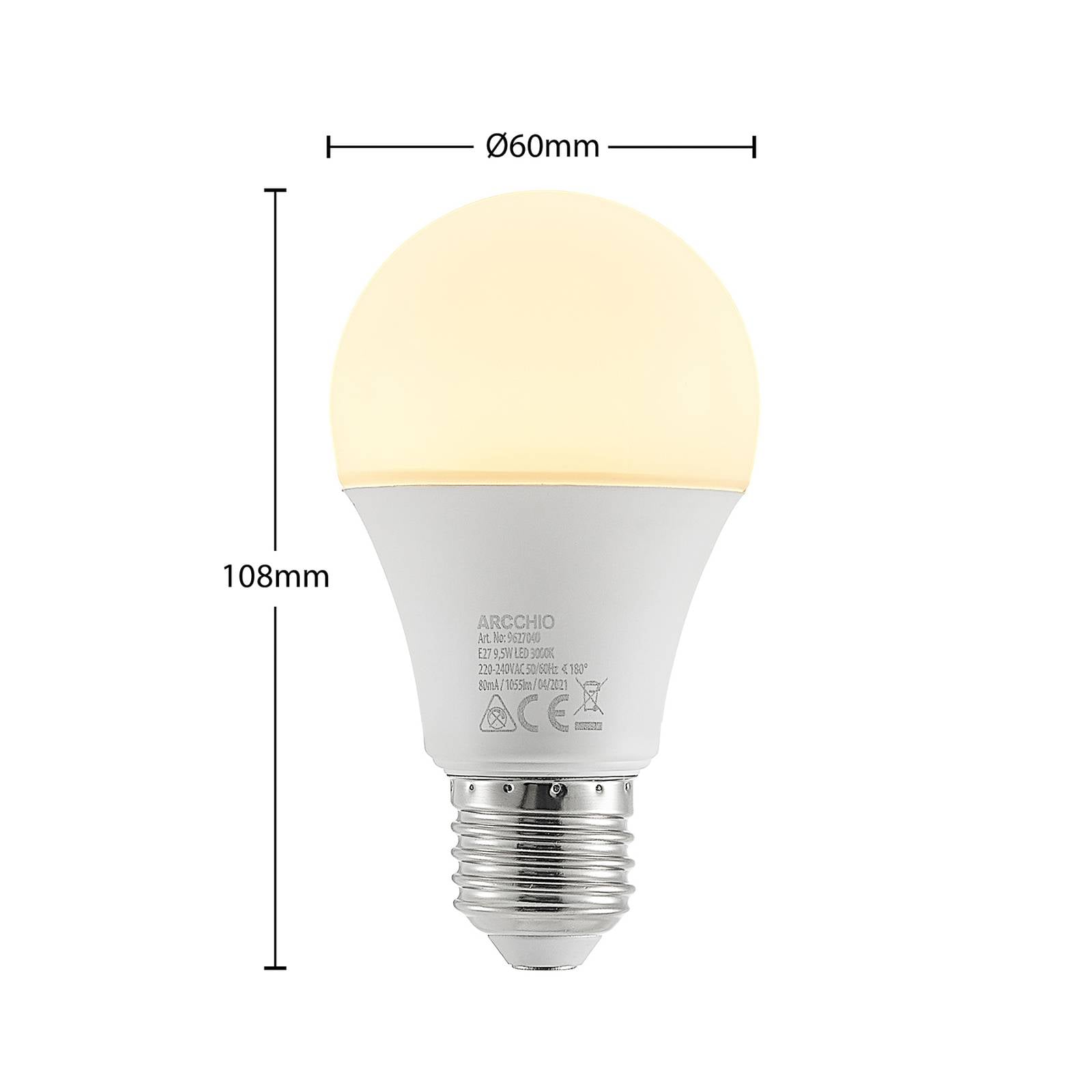 LED žiarovka E27 A60 9,5 W z plastu, opálová s teplou bielou farbou svetla (3 000 K) v sade 3Svietivosť tejto LED žiarovky zodpovedá svietivosti bežnej žiarovky so spotrebou energie 75 W, preto je toto svietidlo energeticky úspornou alternatívou na použitie v rôznych oblastiach. – nie je stmievateľná – LED žiarovka sa dodáva v praktickej súprave 3 kusov