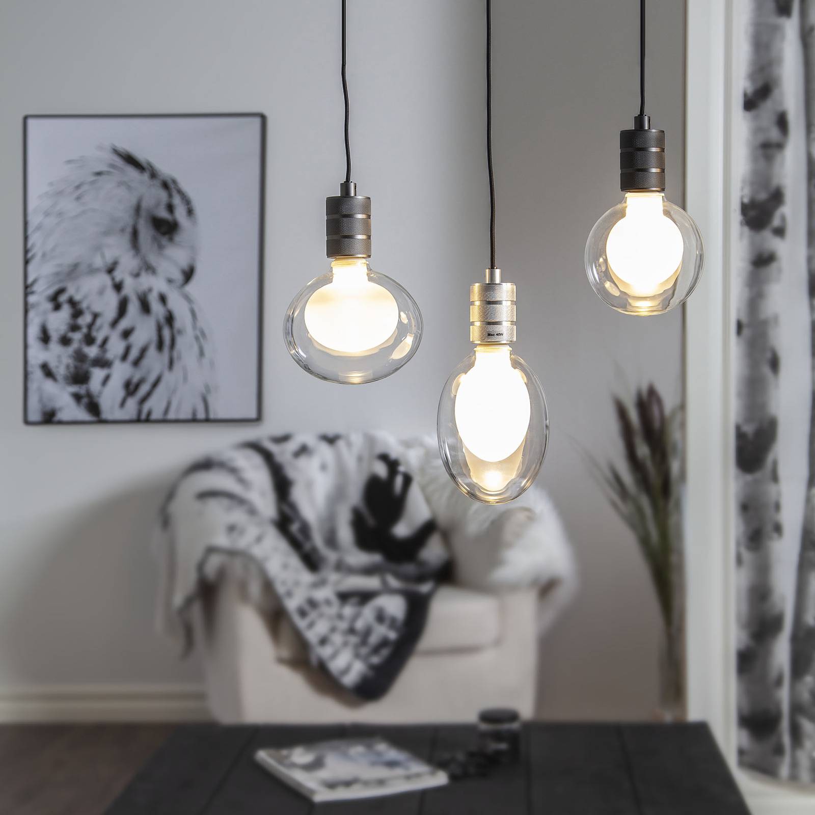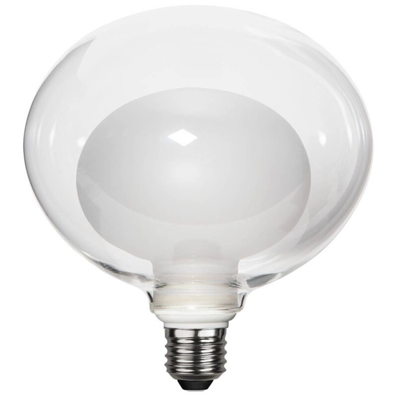 Dvojfázová LED žiarovka Space, E27, 3,5 W, 350 lúmenov, teplá biela 2 700 K, 16,2 x 15 cm Vďaka funkcii 3-stupňového stmievania možno LED žiarovku pohodlne stmievať v troch stupňoch prostredníctvom bežného nástenného vypínača. Svetelný výkon je možné nastaviť od 55 do 190 a až do 350 lúmenov. – homogénne rozloženie svetla bez oslnenia vďaka opálovo bielemu sklu – vonkajšia guľa z číreho skla