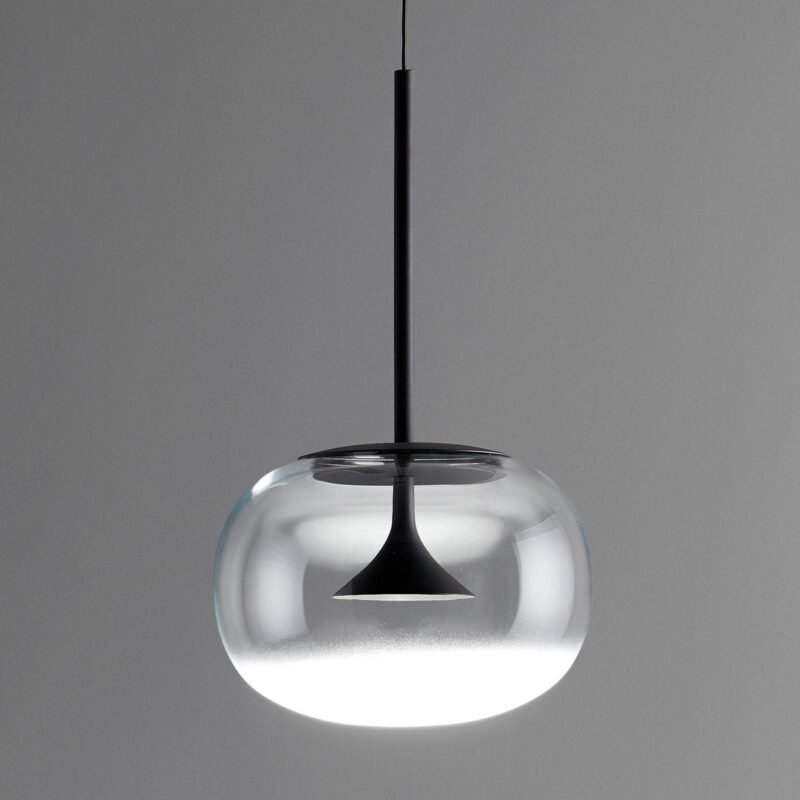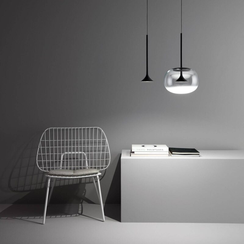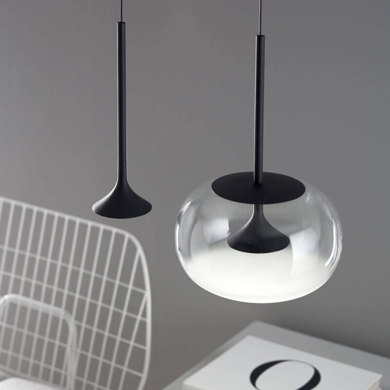 LED závesné svietidlo Alive s účinným dvojitým tienidlom Závesné svietidlo Alive od Francesca Vilaróa je čierne, jednoducho navrhnuté závesné svietidlo, ktoré vyžaruje svetlo priamo nadol. Na ceste nadol je však svetlo vystavené druhému tienidlu zo skla, ktoré obklopuje čierne kovové tienidlo. V dôsledku lomu svetla sa svetlo šíri do všetkých strán aj v spodnej časti skla. So závesným svietidlom Alive LED možno dosiahnuť pôsobivé osvetlenie v kombinácii s mnohými variantmi moderného nábytku. – Elektronický predradník je súčasťou balenia