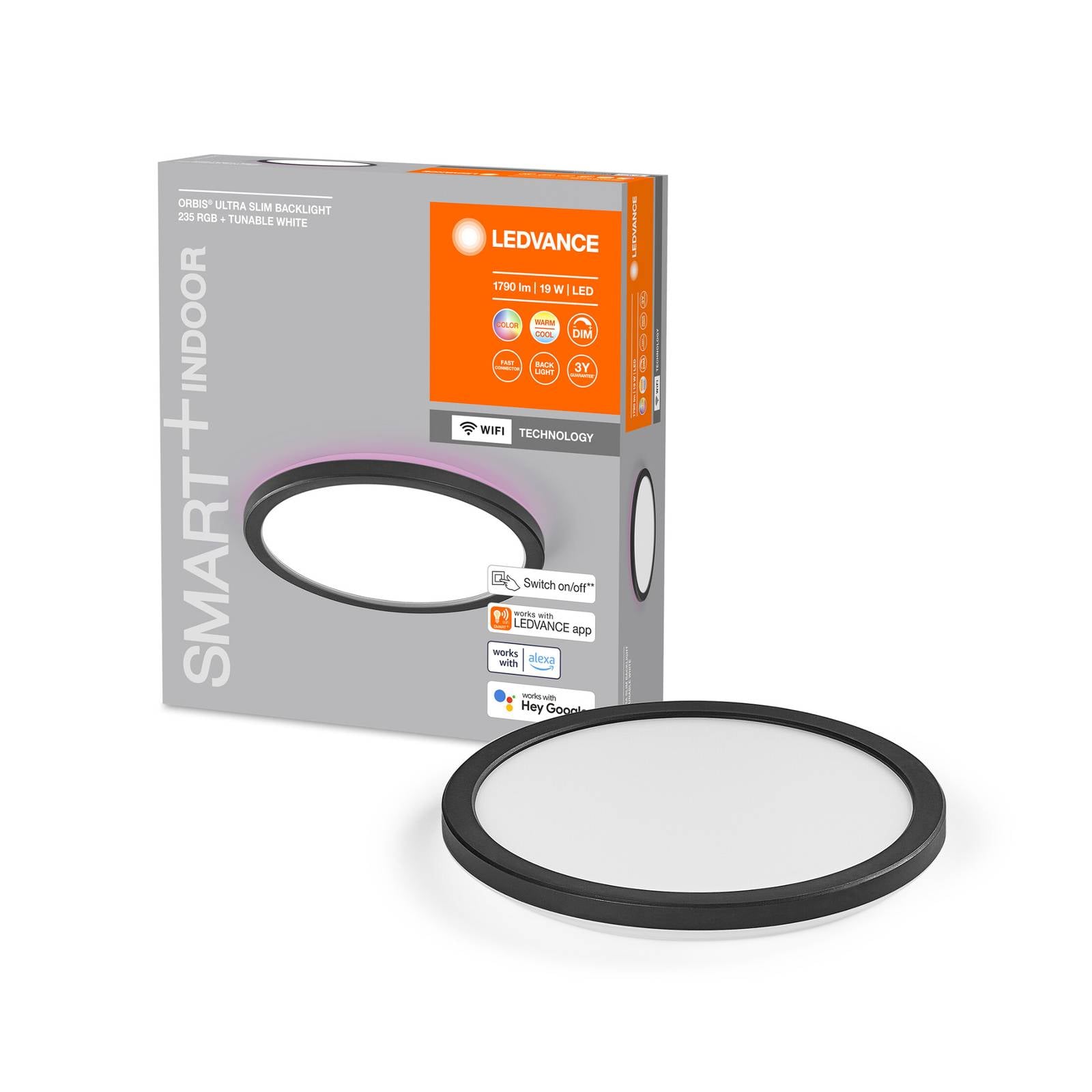 Okrúhle, mimoriadne ploché stropné svietidlo Orbis Ultra Slim Backlight LED s technológiou LEDVANCE SMART+ WiFi Stropné svietidlo Orbis Ultra Slim Backlight LED je vyrobené z plastu a pozostáva z úzkeho okrúhleho rámu a plochého opálového difúzora. Okrem LED diód vyžarujúcich smerom nadol sú v zadnej časti integrované ďalšie diódy. Oba svetelné zdroje sa dajú ovládať samostatne. Možno tak napríklad dosiahnuť efektívne osvetlenie miestnosti v teplom bielom až dennom bielom farebnom svetle s farebným stropným osvetlením. Jas, farbu svetla a teplotu farieb možno nastaviť prostredníctvom aplikácie v tablete/smartfóne alebo hlasovým príkazom. Stropné svietidlo je integrované pomocou technológie LEDVANCE SMART+ WiFi cez WLAN. Technické údaje / kompatibilita: – Všestranné nastaviteľné svetlo: Nastaviteľné biele svetlo s teplotou 2 700 až 6 500 K a svetlo RBG so 16 miliónmi farieb v ráme na prispôsobenie farby svetla osobným požiadavkám. Panelové svetlo je tiež stmievateľné – Jednoduchá inštalácia: Jednoduchá & rýchla inštalácia. Rozsiahle montážne a pripojovacie príslušenstvo je súčasťou dodávky. – Inteligentné ovládanie: Možno ho ovládať pomocou diaľkového ovládača Smart+ WiFi (nie je súčasťou dodávky), aplikácie pre smartfón alebo inteligentného reproduktora. Kompatibilný s Alexa, Google & a ďalšími. Možno zapínať a vypínať vypínačom – Dlhá životnosť: Toto panelové svetlo LED zaujme dlhou životnosťou až 30 000 hodín. S výkonom 25 W a svetelným tokom 2 940 lm vyžaruje veľmi jasné svetlo. Výrobok je energeticky úsporný – Trieda ochrany IP20: Vhodné do obývacích izieb a pracovní. Trieda krytia IP20 poskytuje ochranu prstov pre komponenty pod napätím. Svietidlo nie je chránené proti vode a vlhkosti.