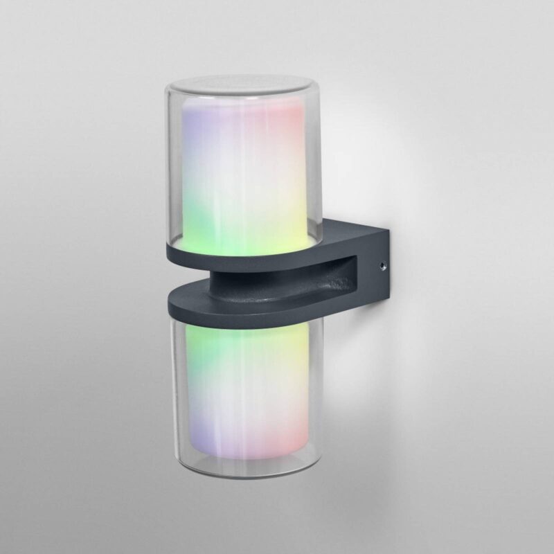 Vonkajšie nástenné svietidlo LED Outdoor Flare Updown Wall s technológiou LEDVANCE SMART+ WiFi, RGBW Vonkajšie nástenné svietidlo LED Outdoor Flare Updown Wall upúta pozornosť svojím špeciálnym vzhľadom. Nástenný držiak je vyrobený z tmavosivého hliníka, zatiaľ čo difúzory sú zarovnané smerom nahor a nadol a sú vyrobené z bieleho polykarbonátu. Príjemné teplé svetlo vyžaruje do okolia na všetky strany. Svietidlo možno použiť vo vstupnom priestore, na balkóne alebo terase. Jas a zmenu farieb RGBW možno pohodlne ovládať pomocou aplikácie alebo hlasového príkazu. Integrácia sa vykonáva pomocou technológie LEDVANCE SMART+ WiFi prostredníctvom siete WLAN. – Ovládanie prostredníctvom aplikácie LEDVANCE SMART+ WiFi (s operačným systémom Android minimálne 4.4 alebo iOS 9.0) zdarma; umožňuje prednastavenia a automatizácie. – Možnosť hlasového ovládania cez Google Assistant alebo Amazon Alexa (vyžaduje kompatibilný systém inteligentnej domácnosti). – Teplota farby: 3 000 K – Ovládanie farieb RGB, približne 16 miliónov nastaviteľných farieb – stmievateľné – Sieťový protokol: WiFi – Trieda ochrany IP44