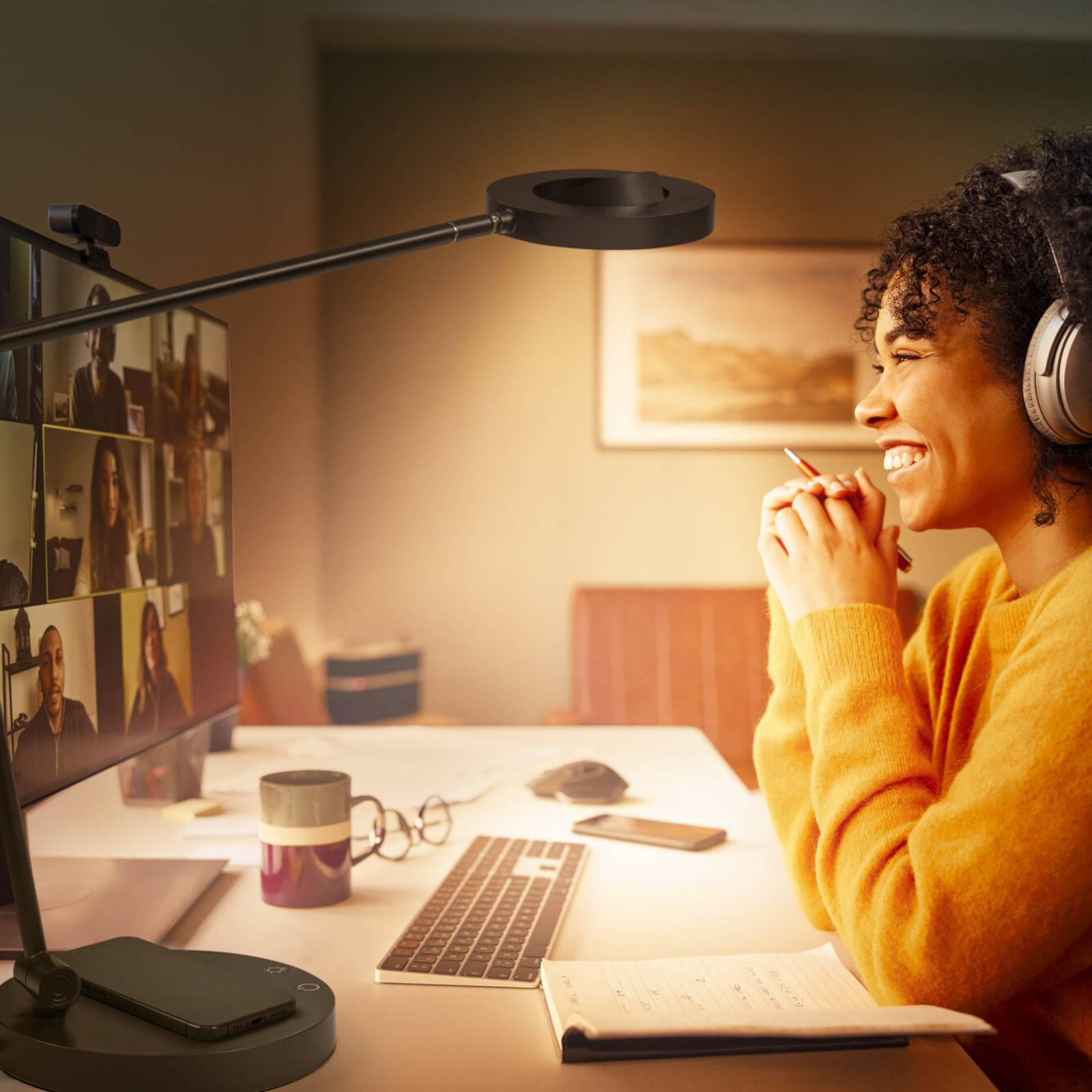 Flexibilne nastaviteľná, ovládateľná cez Wi-Fi a s nabíjacou stanicou QI v podstavci: Stolná LED lampa SUN@Home Panan Desk Disc, Ra95, CCT, technológia HCL, stmievateľná Stolná LED lampa SUN@Home Panan Desk Disc je multitalent v oblasti inteligentnej domácnosti. Po mechanickej aj technickej stránke na vás čaká nespočetné množstvo možností nastavenia. Ramená možno vďaka niekoľkým kĺbom nastaviť podľa potreby a vnútornú časť hlavy svietidla možno tiež otáčať na optimálne nastavenie svetelného kužeľa. V základni je integrovaná nabíjacia stanica QI, ktorú možno použiť na indukčné nabíjanie kompatibilných smartfónov a iných elektronických zariadení. V základni sa nachádzajú aj spínače na manuálne ovládanie svetelných funkcií. Pomocou nich možno nastaviť teplotu farieb (teplá biela až univerzálna biela) a intenzitu svetla možno aj plynule stmievať. Na pohodlné ovládanie je k dispozícii bezplatná aplikácia LEDVANCE SMART WiFi pre systémy Android a iOS. Prostredníctvom pripojenia WLAN možno všetky funkcie ovládať prostredníctvom smartfónu alebo tabletu a ovládanie hlasovými povelmi je možné aj pomocou Amazon Alexa a Google Assistant (vyžaduje sa kompatibilný systém inteligentnej domácnosti). Ďalšou zaujímavosťou tejto inteligentnej domácej stolnej lampy je takzvaná technológia Human Centric Lighting (HCL). Ide o automatické riadenie nastavenia svetla, ktoré je orientované na prirodzený biorytmus alebo typický priebeh slnka počas dňa. Séria SUN@Home dostala svoj názov vďaka mimoriadne dobrému podaniu farieb (CRI 95). Inovatívne plnospektrálne LED diódy majú zníženú zložku modrého svetla. To môže zvýšiť pohodu a mať pozitívny vplyv na náladu, a tým aj na zdravie. Okrem toho farby osvetlené týmto svetlom pôsobia mimoriadne prirodzene. Povrchová úprava proti domácim baktériám a zápachu dopĺňa tento multitalent inteligentnej domácnosti. Technické vlastnosti / kompatibilita – ovládanie prostredníctvom bezplatnej aplikácie LEDVANCE SMART WiFi; umožňuje prednastavenia a automatizácie – možnosť hlasového ovládania prostredníctvom Google Assistant alebo Amazon Alexa (vyžaduje kompatibilný systém inteligentnej domácnosti) – inovatívne plnospektrálne diódy SunLike LED s mimoriadne dobrým podaním farieb (CRI 95) a zníženým obsahom modrého svetla – funkcia biorytmu (HCL) na automatické ovládanie teploty farieb – teplota farieb nastaviteľná manuálne: 2 200 – 5 000 Kelvinov – plynulé stmievanie prostredníctvom aplikácie, hlasového ovládania alebo manuálne prostredníctvom vypínača – sieťový protokol: Špeciálne funkcie – viacnásobné nastavenie pomocou kĺbov – otočné vnútorné tienidlo na vyrovnanie svetelného kužeľa – umožňuje zvýšiť koncentráciu a efektivitu – môže zlepšiť celkovú úroveň aktivity a bdelosť počas dňa, ako aj rytmus a intenzitu spánku – s povrchovou úpravou proti domácim baktériám a zápachu – vrátane nabíjacej stanice QI v základni na nabíjanie smartfónov (indukčné, bezdrôtové nabíjanie)