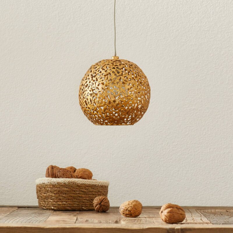 Závesné svetlo cappuccino – zlato sfarbený sen pre všeobecné atmosférické osvetlenie So závesnou lampou Cappuccino svetlo jemne vykúka cez výklenky v sférickom zlatom odtieni železa a vytvára v miestnosti príťažlivé svetelné akcenty. Tón teplého zlata sa brilantne leskne a robí cappuccino nepostrádateľným doplnkom vyváženého konceptu osvetlenia. Vrátane prístrešku so zabudovaným transformátorom.