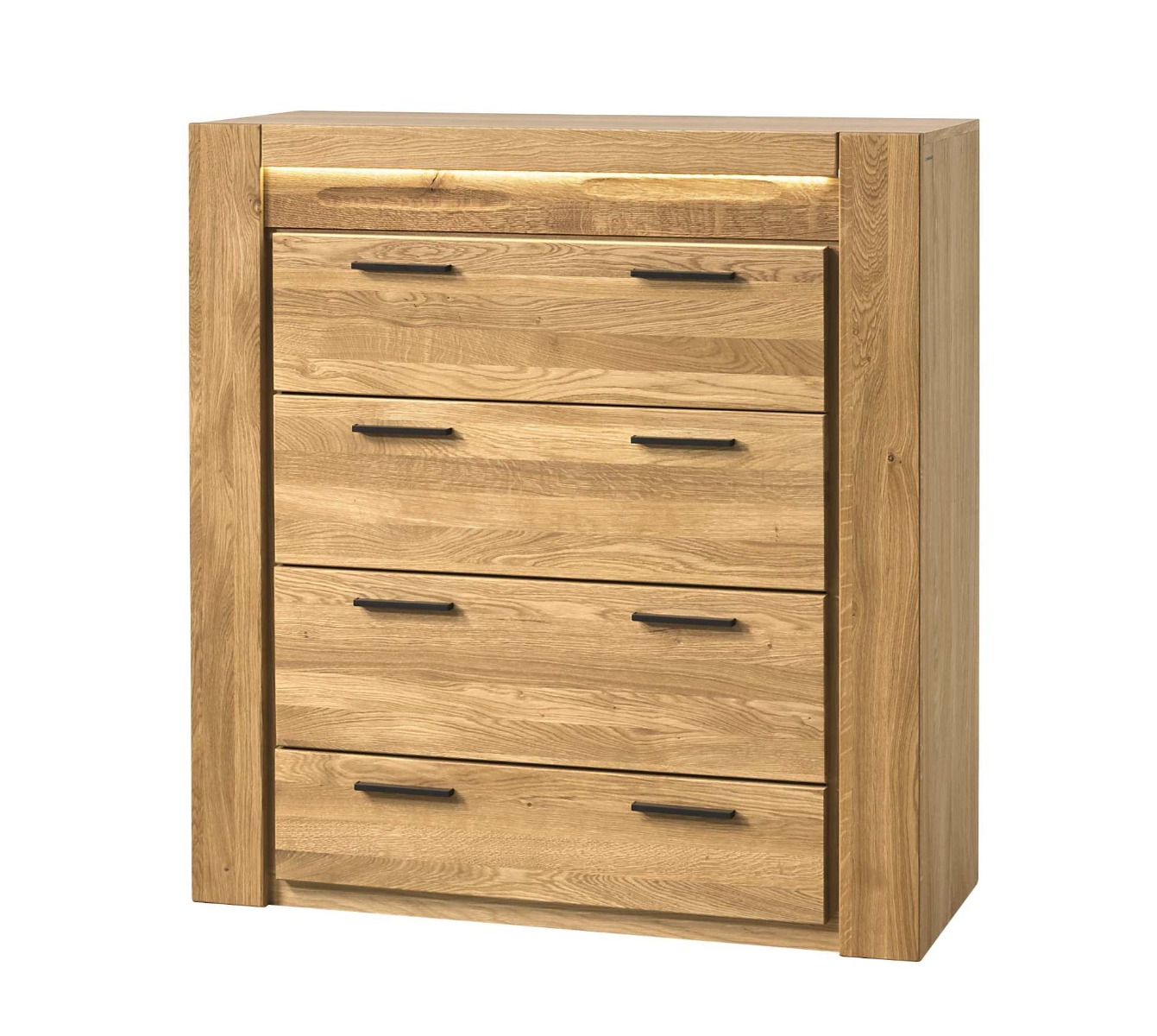 Nábytok LEVET je štýlovým luxusným nábytkom vhodným do obývačky či jedálne. Je dokonalý do každého interiéru. Predná časť nábytku je vyrobená z dubového masívu s tmavým grafitovým sklom, v čiernych hliníkových rámoch. Korpus nábytku je z dubovej dýhy. Police sú vyrobené z tmavého skla a kvalitnej dubovej dýhy.Úchytky sú vyrobené z kovu, v čiernej farbe. Pánty a kovanie je vybavené systémom tichého zatvárania. Povrch je upravený olejom natura, ktorý zvýrazňuje farbu a štruktúru dreva. Zaručuje dlhú životnosť a odolnosť voči poškodeniu. LED osvetlenie je v cene nábytku.Komoda disponuje štyrmi praktickými zásuvkami. Farebné prevedenie: dub Natura.Rozmery:šírka: 105 cmvýška: 110 cmhĺbka: 42 cmV našej ponuke nájdete aj ďalšie prvky sektoru LEVET.