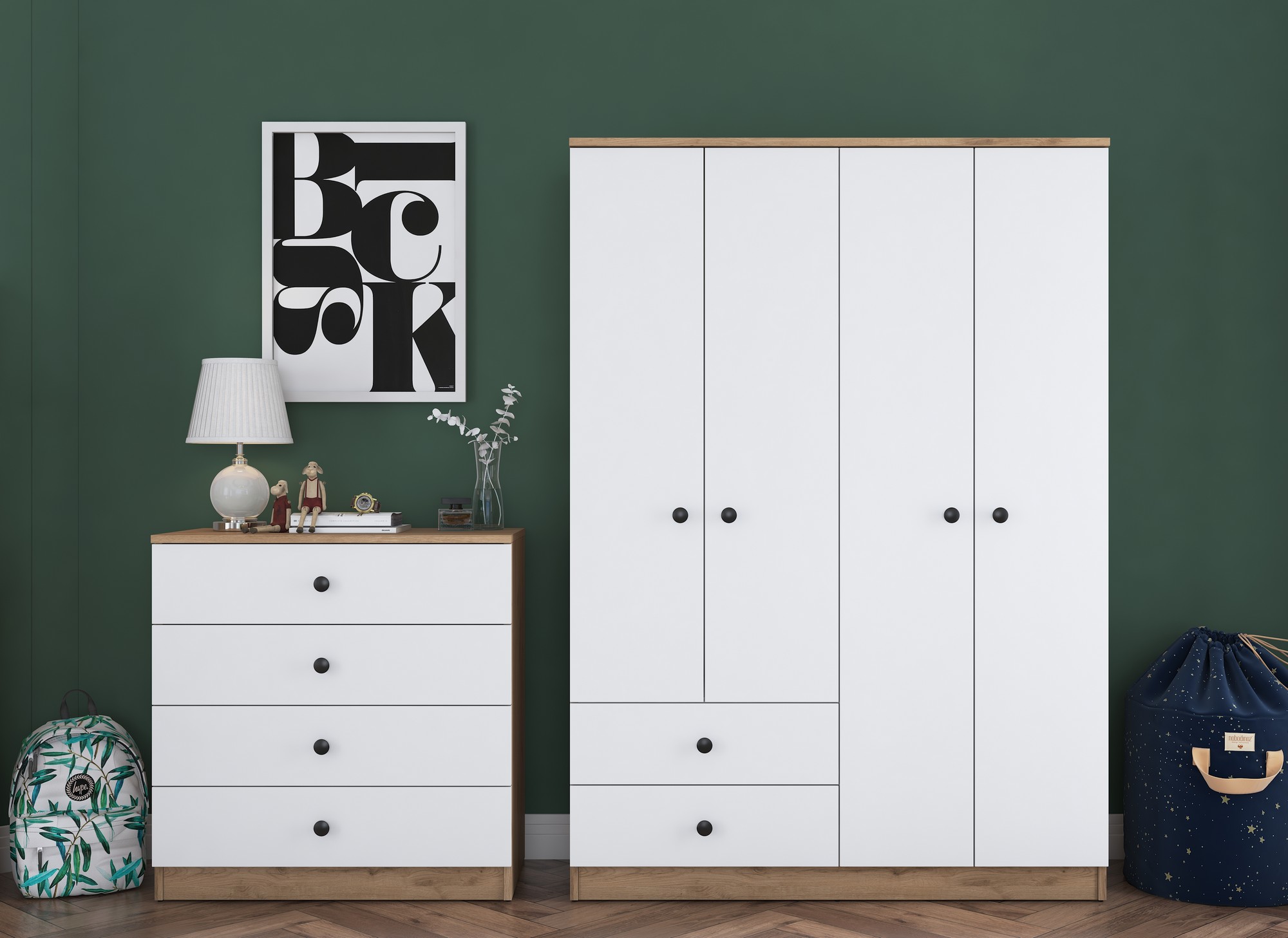 Spálňová zostava LEVI – Elegantná kombinácia šatníkovej skrine a komodySpálňová zostava LEVI je ideálnym riešením pre organizáciu a štýlové vybavenie vašej spálne. Spojenie bielej farby a orechového dekoru dodáva zostave moderný a elegantný vzhľad, ktorý dokonale zapadne do akéhokoľvek interiéru.Hlavné vlastnosti:Typ tovaru: spálňová zostavaRozmer: 170 x 200 x 42.5 cmFarba: biela + orechMateriál: melamín, VT laminaHrúbka materiálu: 18 mmVybavenie: 6 zásuviekZostava obsahuje:šatníková skriňašuplíková komodaDodatočné informácie: dodávame v demonteZostava LEVI obsahuje šatníková skriňa s dostatkom priestoru na zavesenie oblečenia a šuplíkovou komodu, ktorá ponúka 6 zásuviek pre organizáciu posteľnej bielizne, oblečenia alebo doplnkov. Tento praktický a estetický set zaistí poriadok a prehľadnosť vo vašej spálni.Kvalitné materiály, ako melamín a VT lamina, zaisťujú odolnosť voči opotrebovaniu a jednoduchú údržbu. Zostava je dodávaná v demontovanom stave s priloženým návodom na jednoduché zostavenie.Objednajte si spálňovú zostavu LEVI ešte dnes a vytvorte si harmonické a funkčné prostredie vo svojej spálni!
